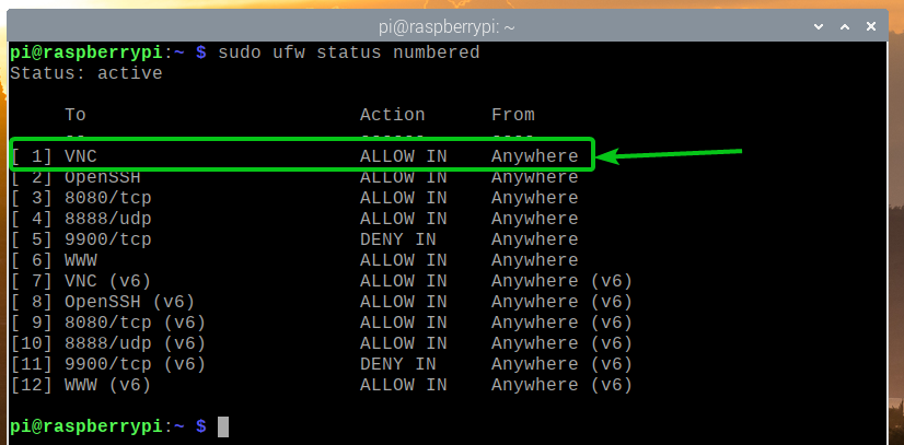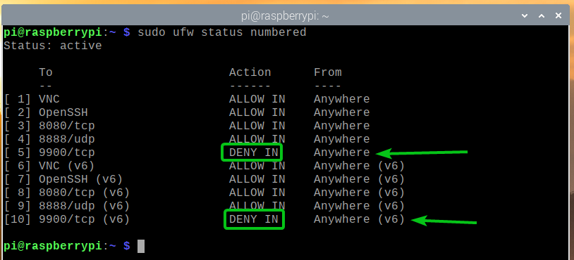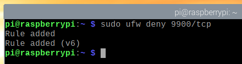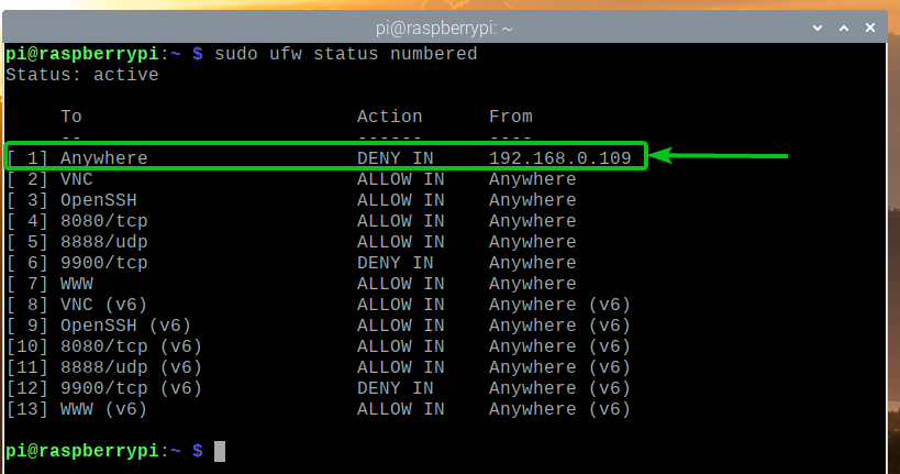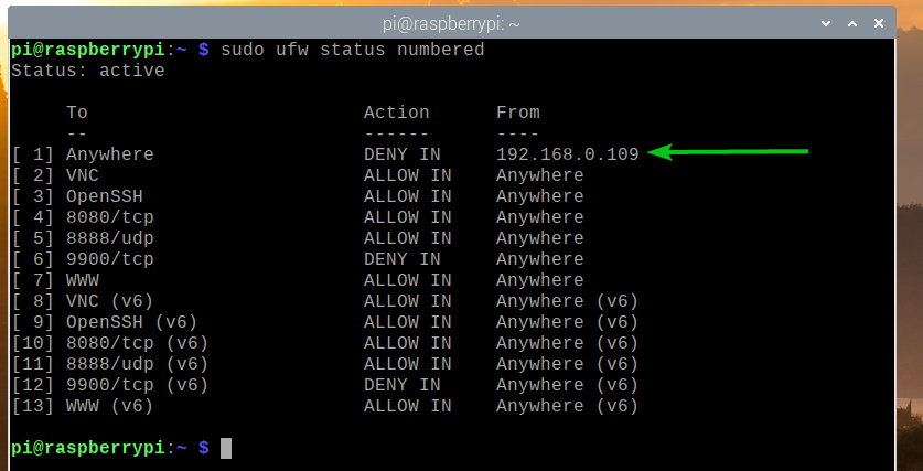 The UFW rule to deny the IP address 192.168.0.109 access to the Raspberry Pi server should be the topmost rule, as shown in the screenshot below.