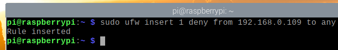 To deny the IP address 192.168.0.109 access to your Raspberry Pi server, you must add the firewall rule at the top (position 1). The order of the UFW rules matters a lot. The most restrictive rules should go first.