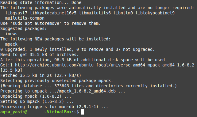 Once the “mpack” package has been installed on your Linux Mint 20 system, along with all the required dependencies, you can run further commands, as shown in the following image: