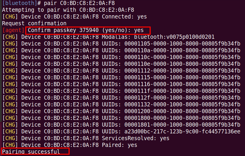 Once you run this command, a pin will appear on the Terminal screen as well as on your other Bluetooth device. If the pin on both devices is the same, type yes. After which, your devices will be paired and you will see Pairing successful message.