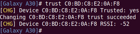 To add your paired Bluetooth device as a trusted device, run this command: # trust <device-MAC>