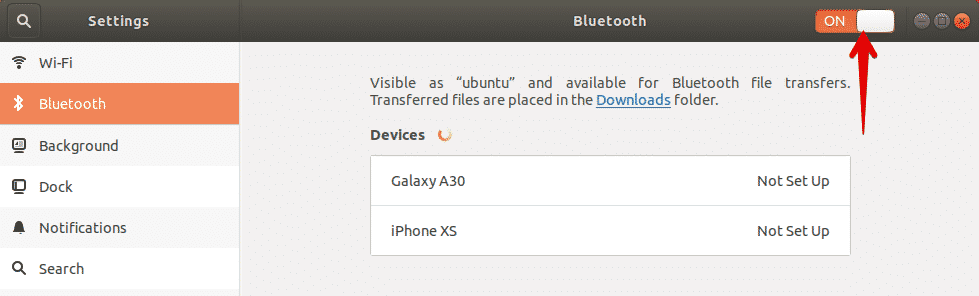 In the Settings utility, select the Bluetooth tab at the left panel. Under the Bluetooth tab, you will see the slider at the top of the window. Click on it to turn it to on position. It will enable the Bluetooth on your system.