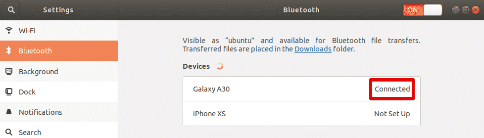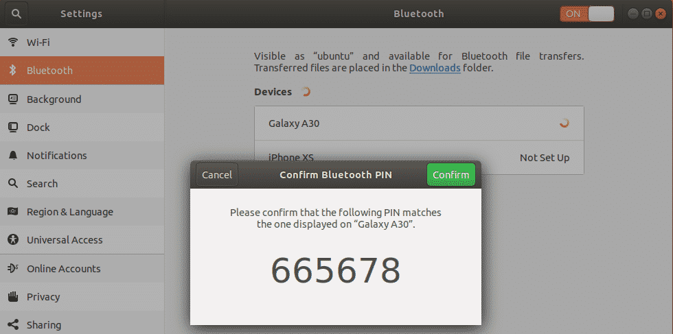 As soon as you enable Bluetooth, the system will start discovering the nearby devices which have Bluetooth enabled. When you find your desired device you want to send files to, select it to pair it with your system. By doing so, a pin will be displayed on your system as well as on your other Bluetooth device. You must ensure the pin on both devices is the same.