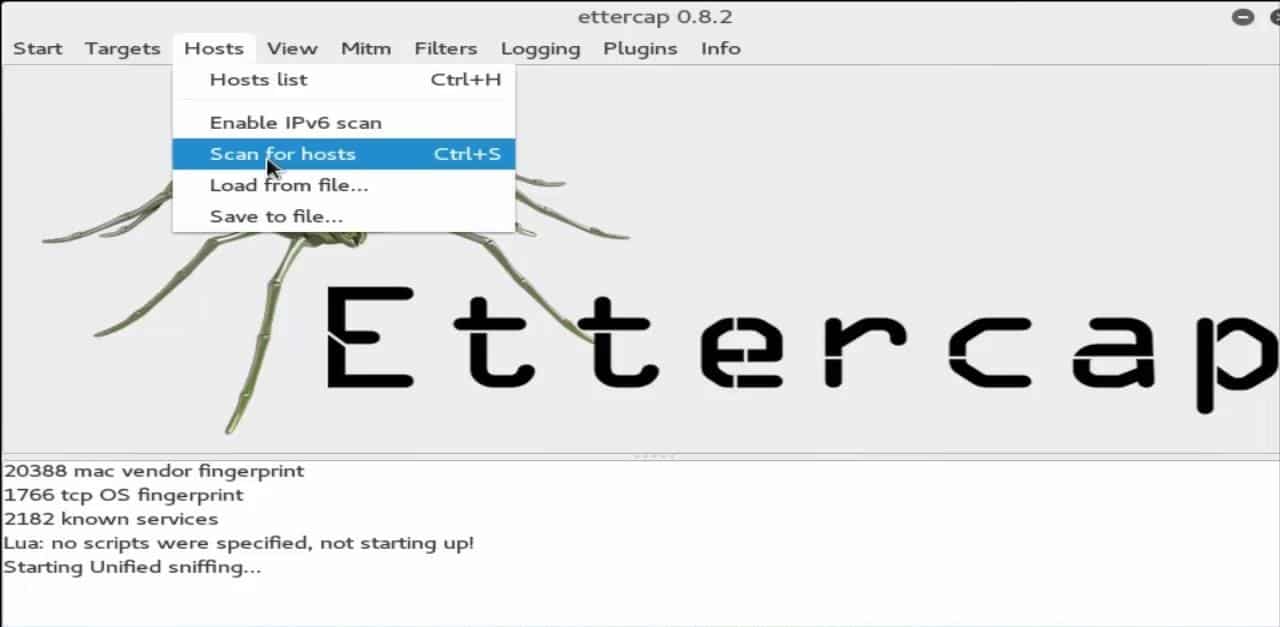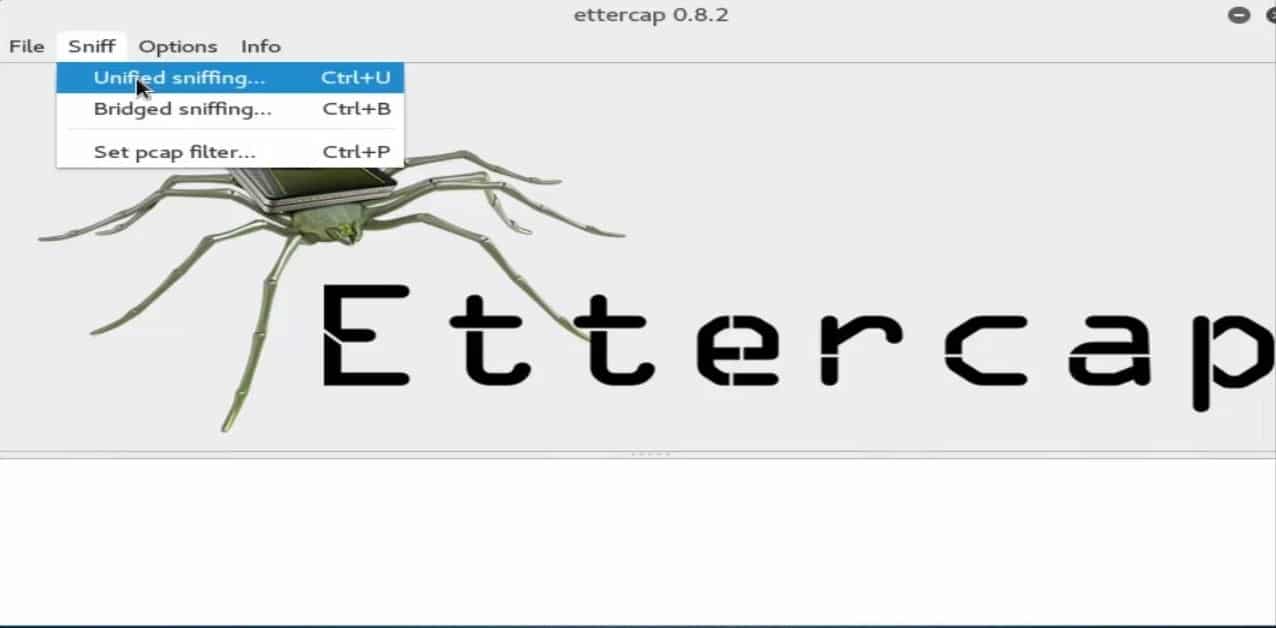 The Ettercap GUI window will be displayed. Go to the menu and select ‘sniff>unisniff,’ as shown in the following window: