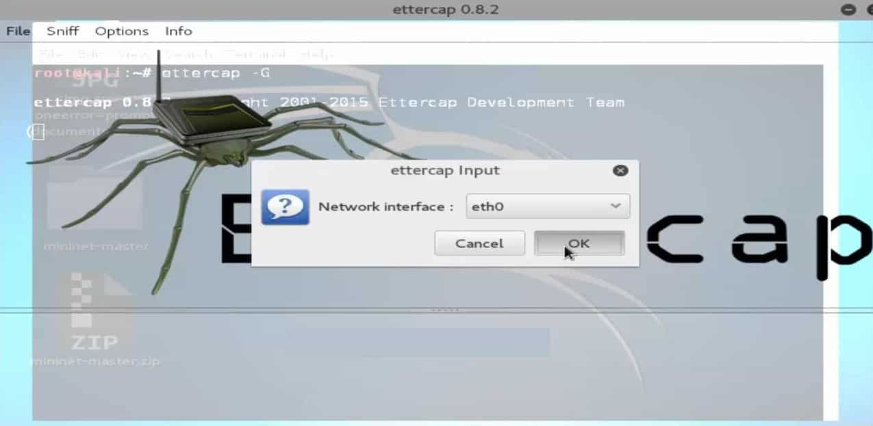 After entering the above command, you will see your default network interface. Now, copy it and select it in the Ettercap menu.