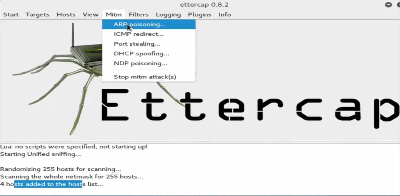 The results will be displayed here. From the submenu, click on the MITM tab and select ‘ARP poisoning.’