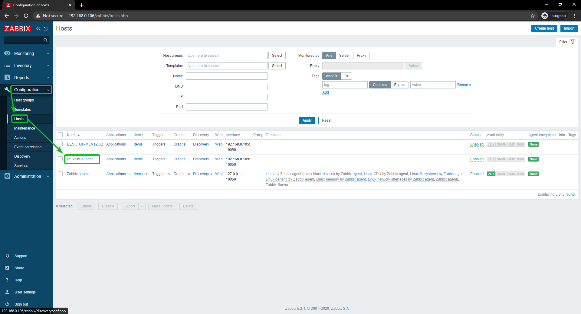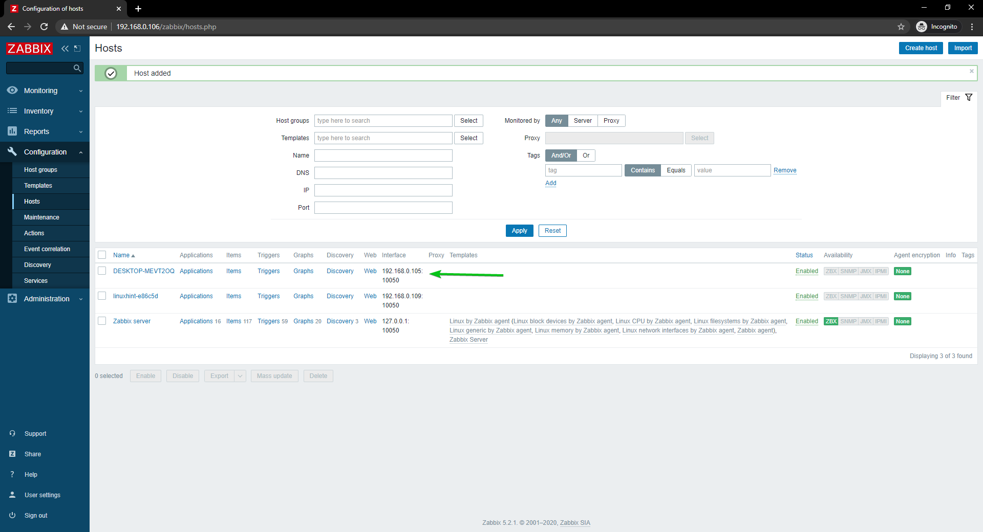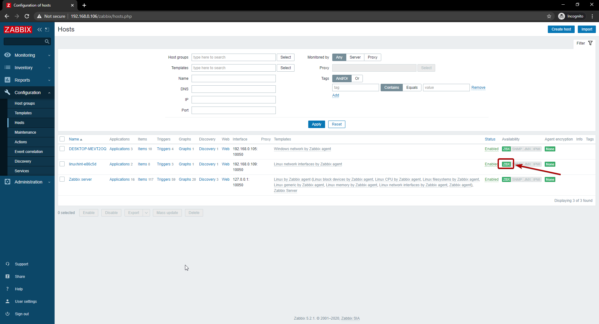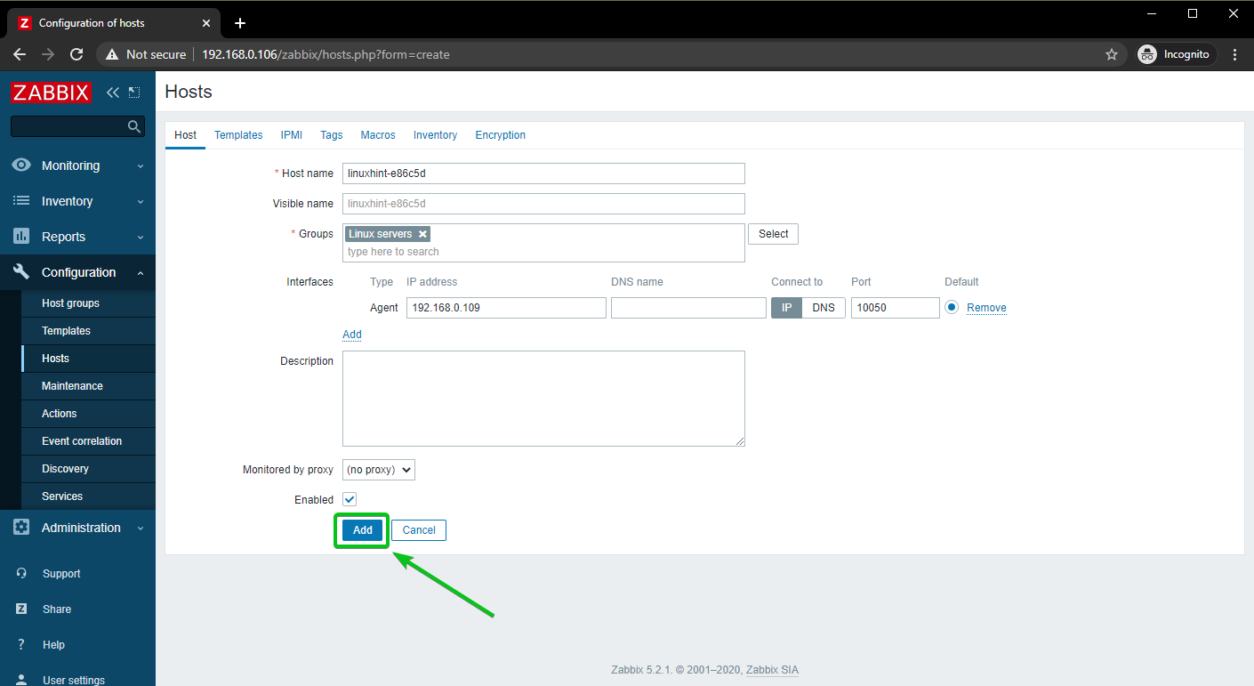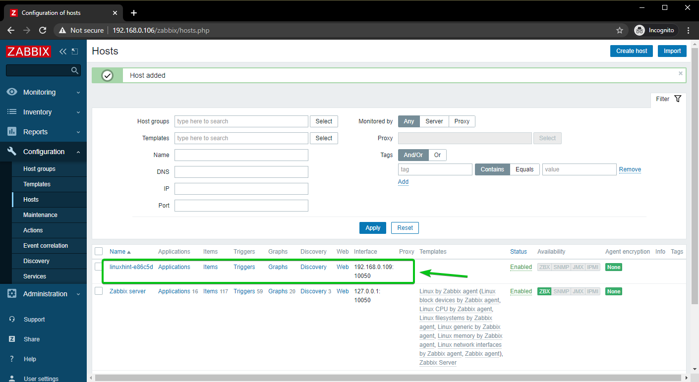 The Linux host should be added to Zabbix, as you can see in the screenshot below.