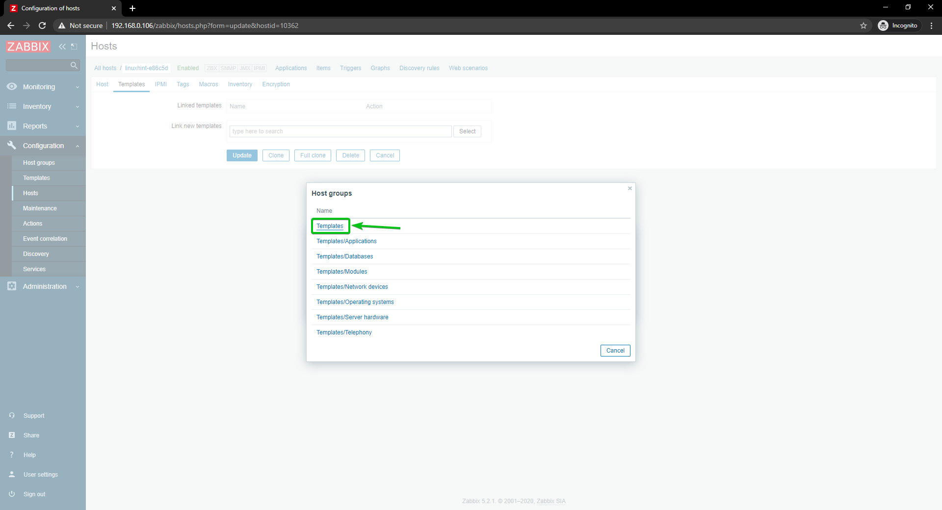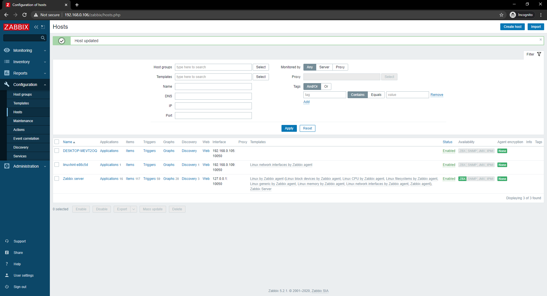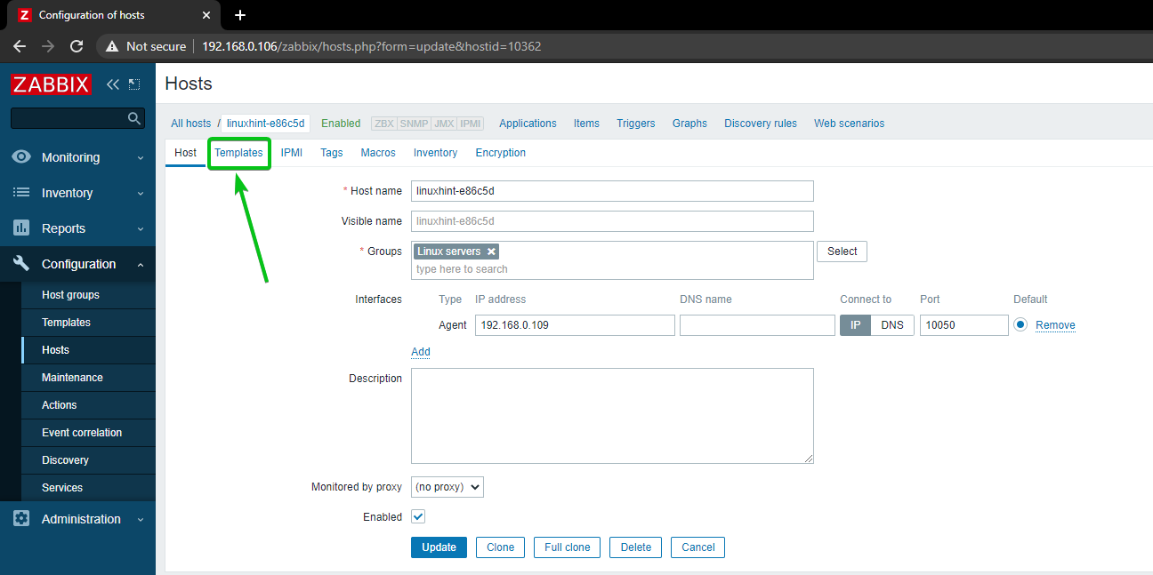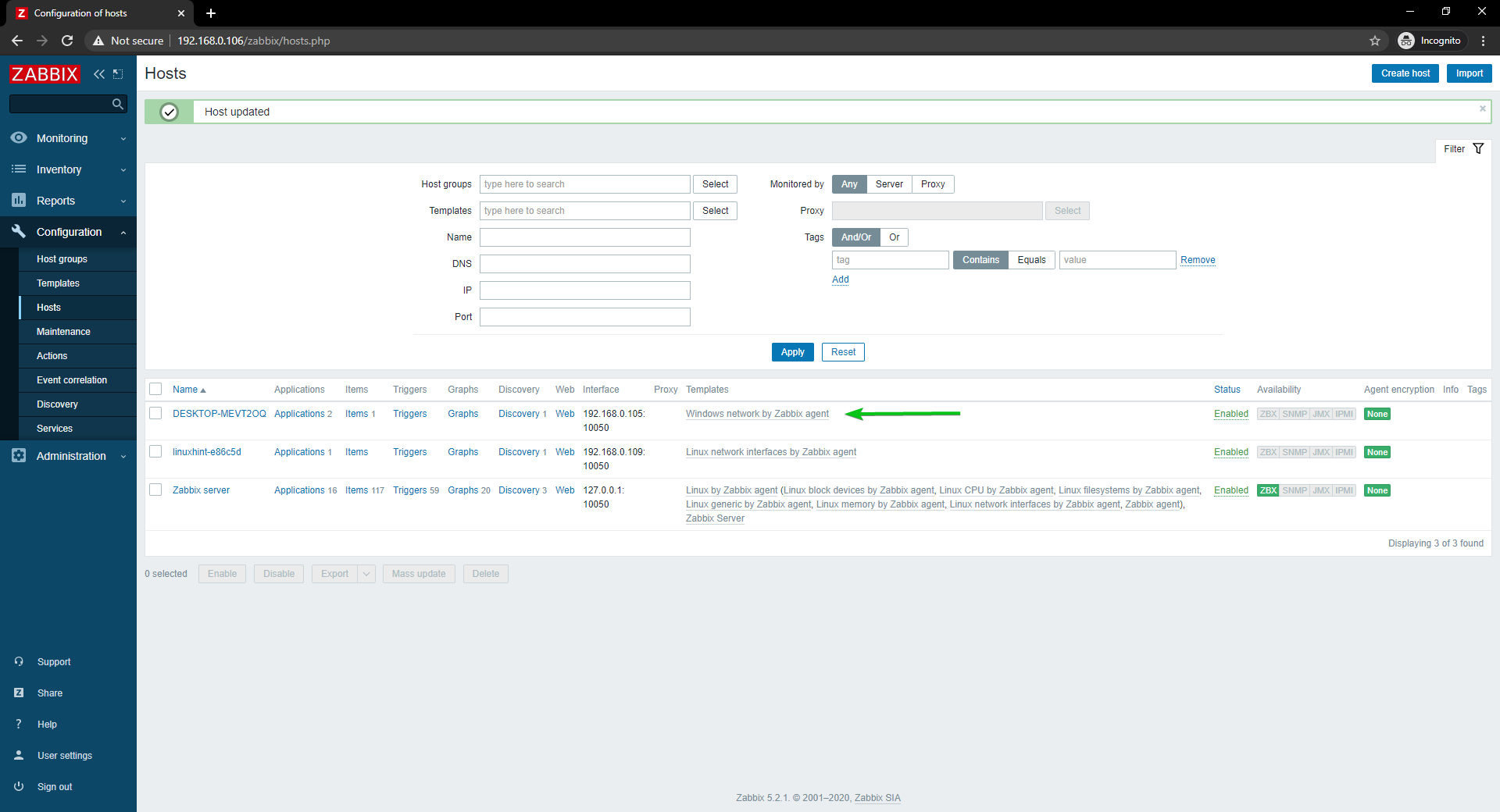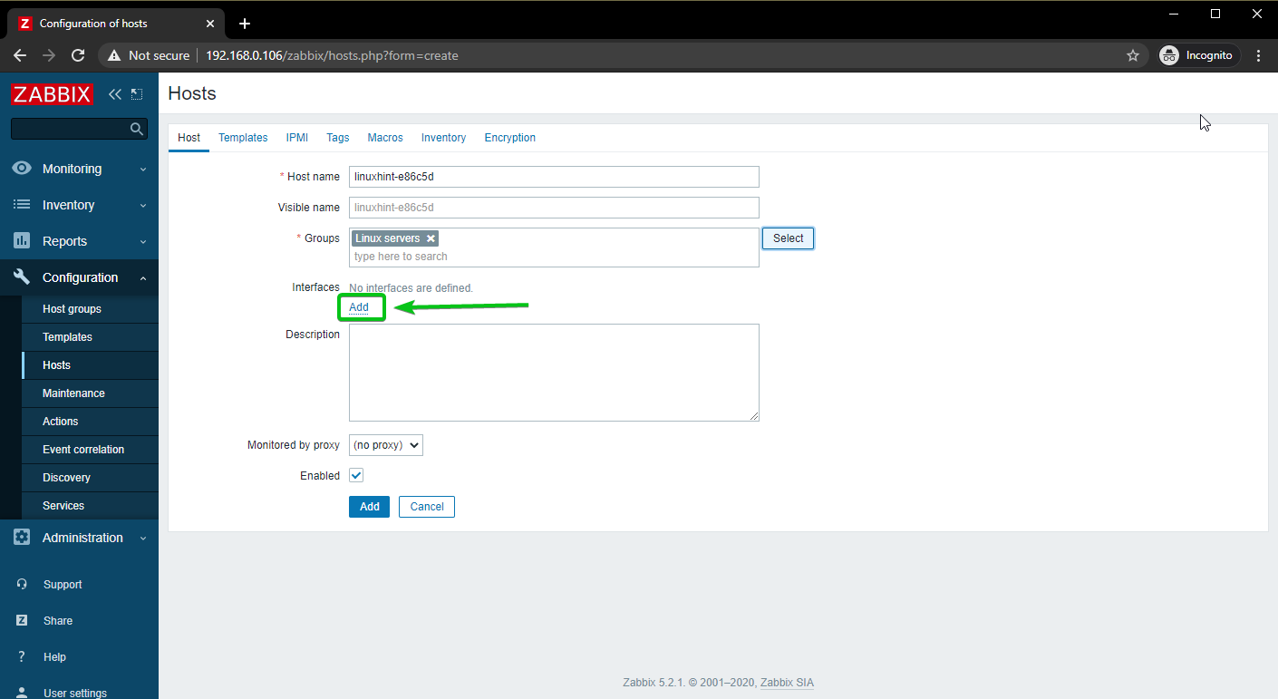The Linux host should be added to Zabbix, as you can see in the screenshot below.