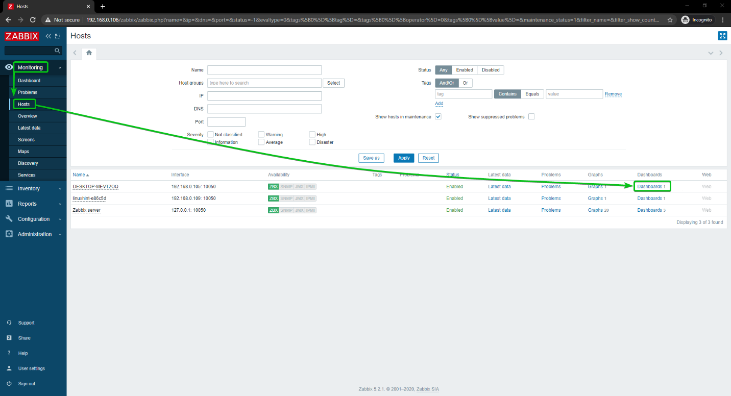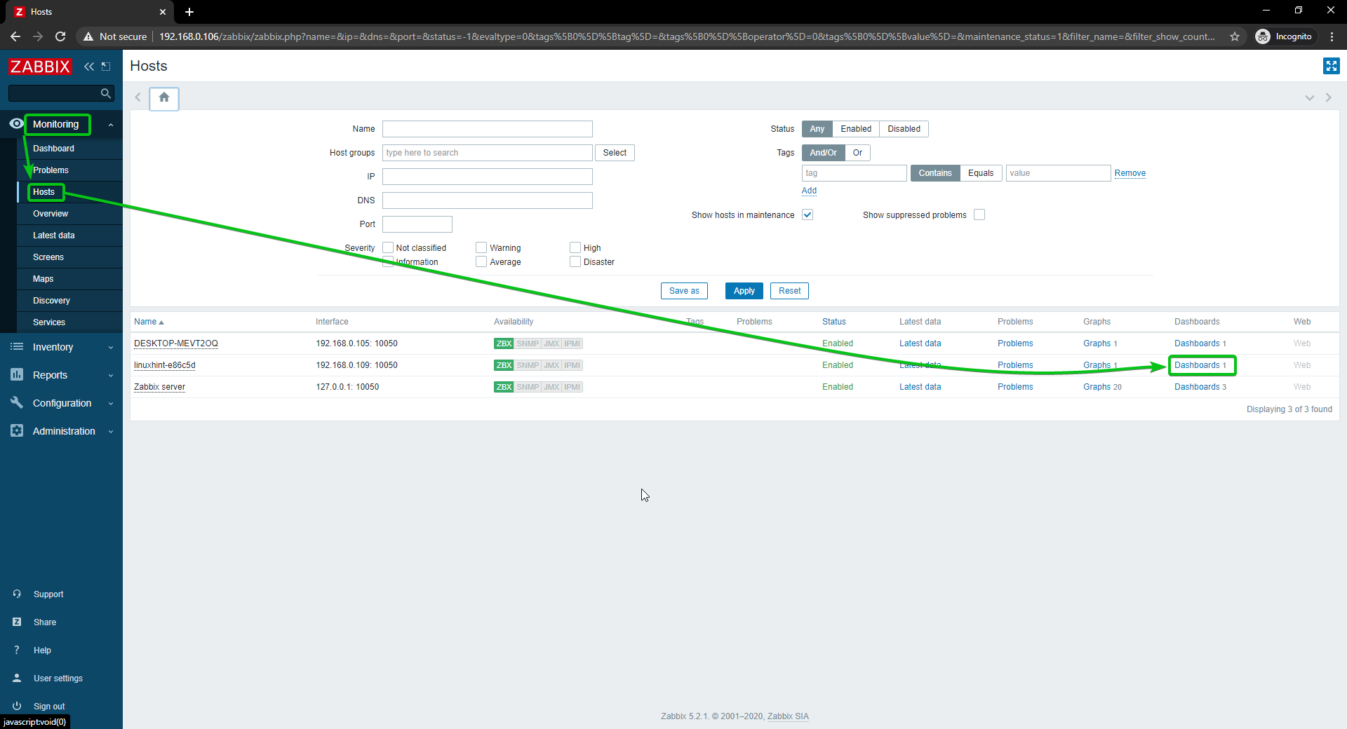 When the ZBX option is highlighted, navigate to Monitoring > Hosts and click on the Dashboards link of your Windows 10 host, as you can see in the screenshot below.