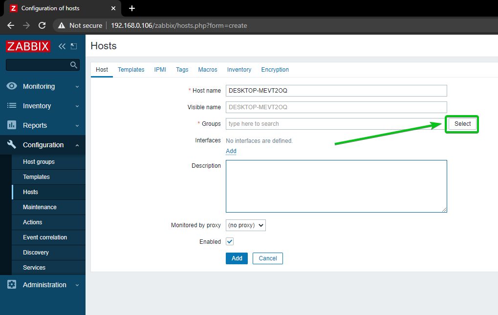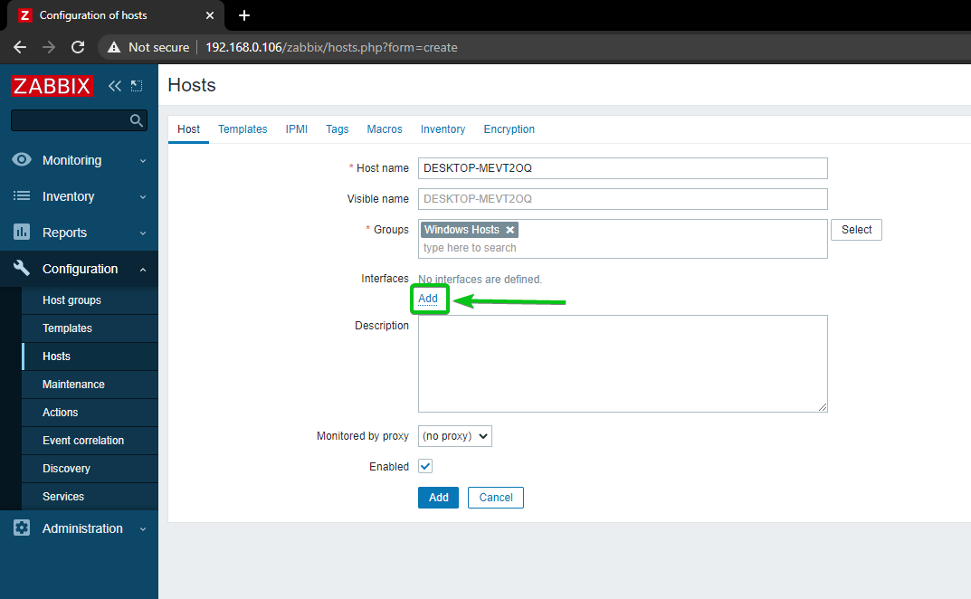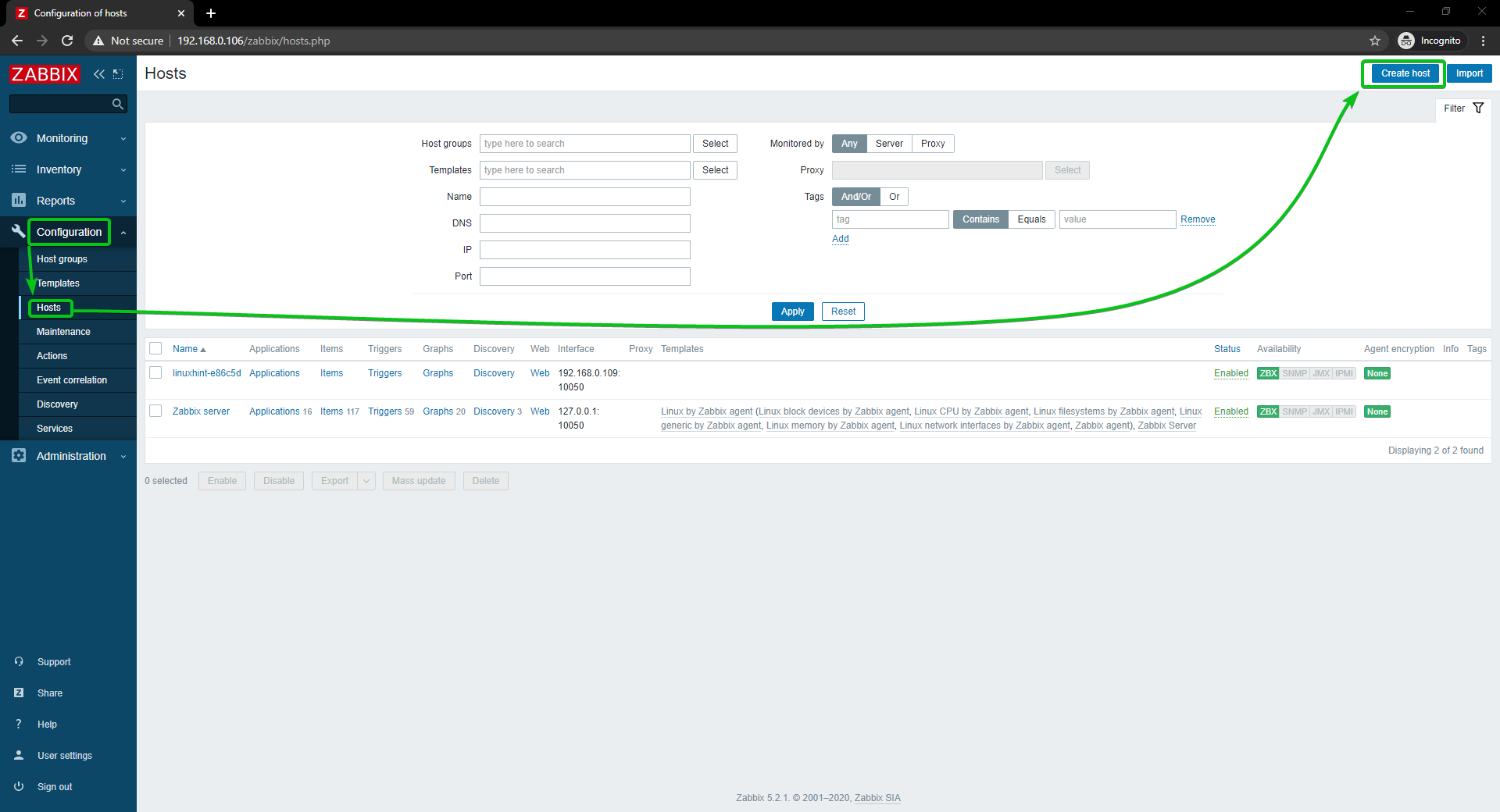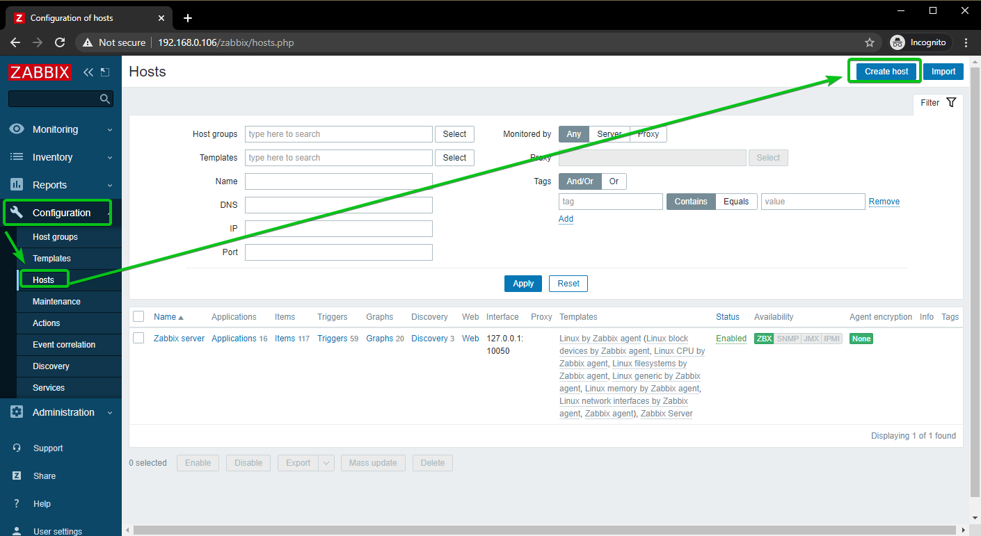 To add your Windows 10 host to Zabbix, go to Configuration > Hosts. Then, click on Create host.