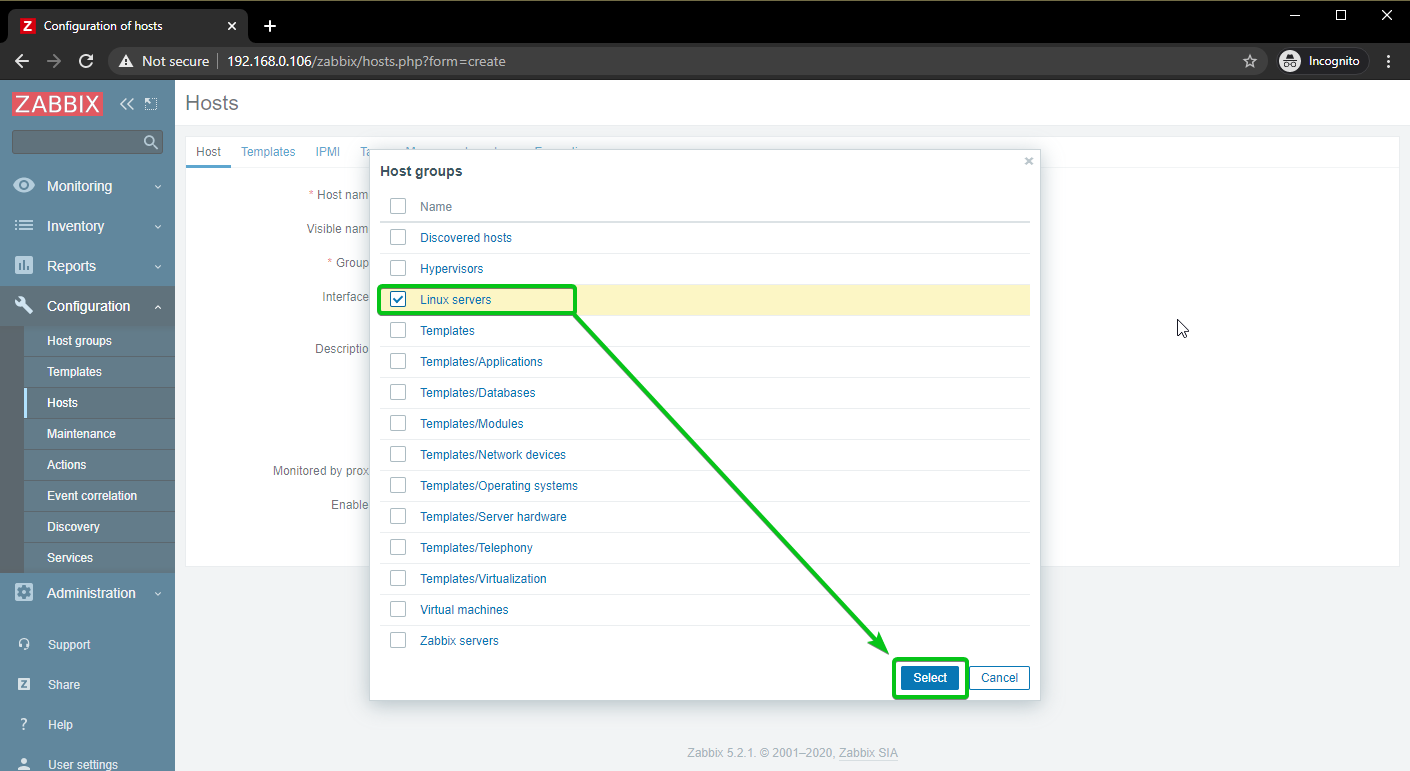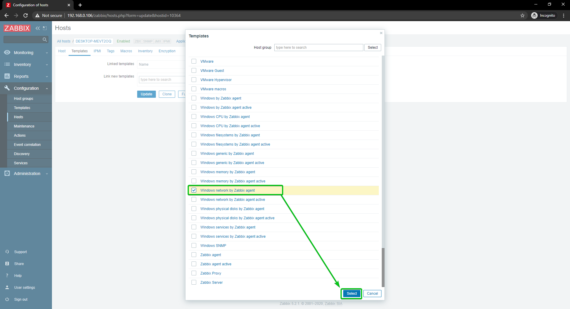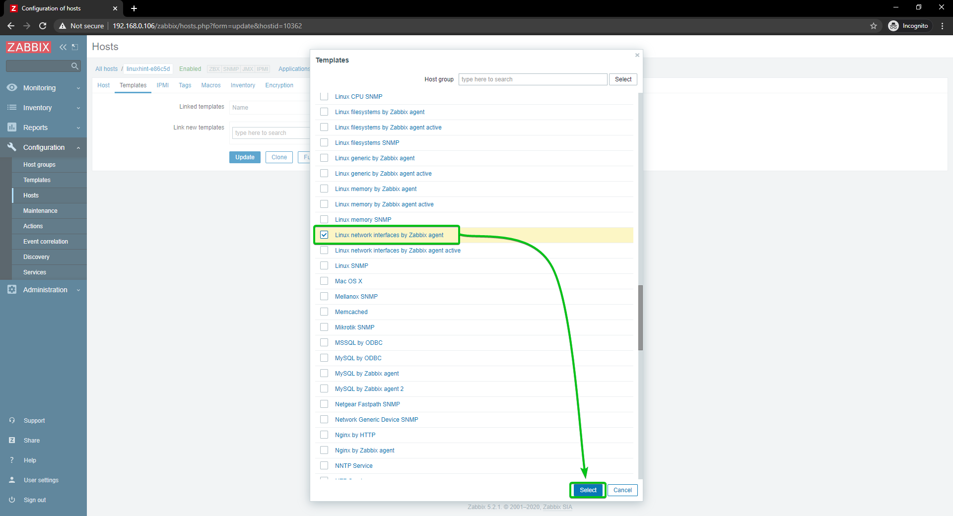 Check Linux network interfaces by Zabbix agent checkbox, and click on Select.