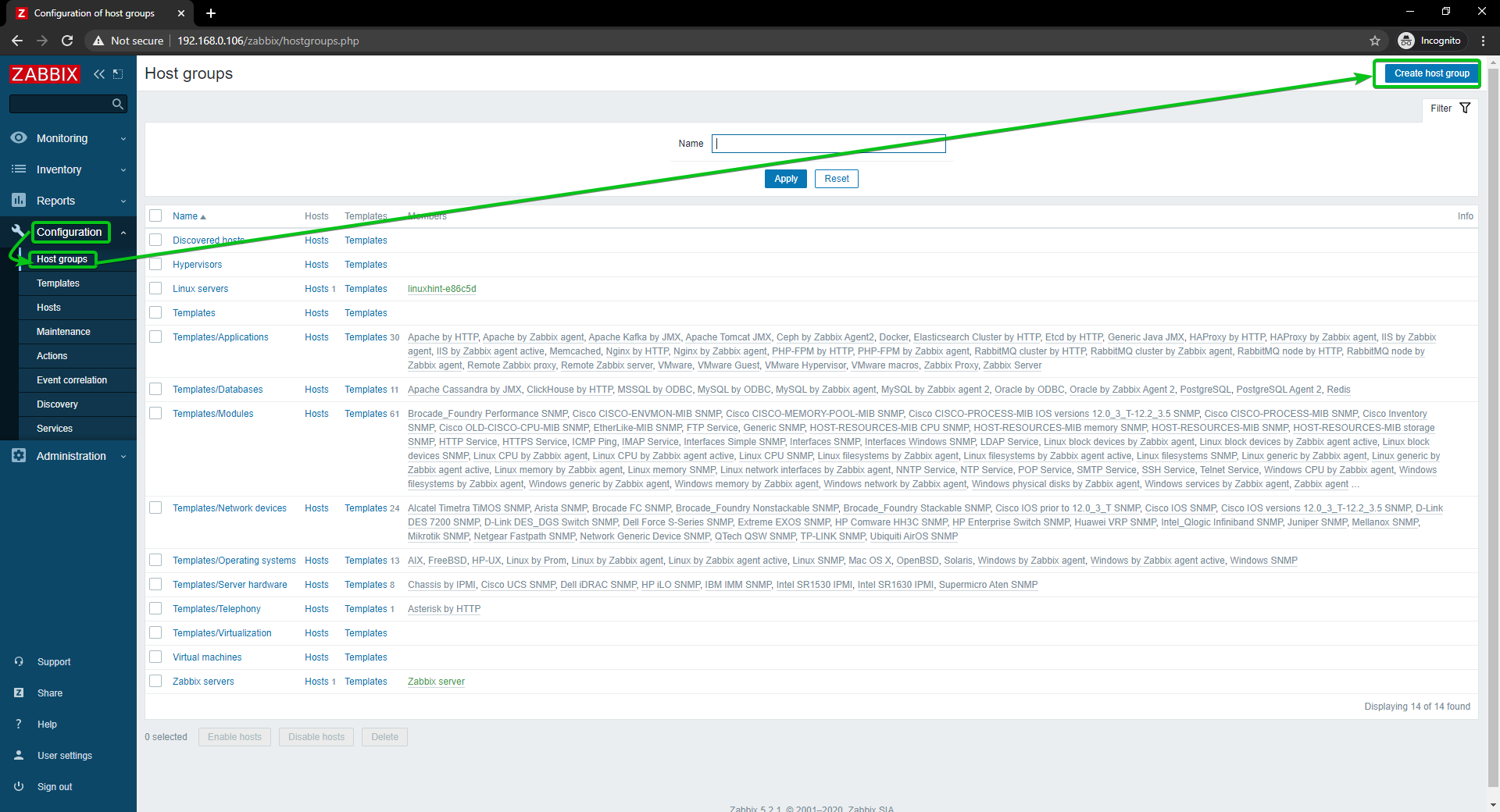 To create a host group, go to Configuration > Host groups from the Zabbix web app. Then, click on the Create host group.