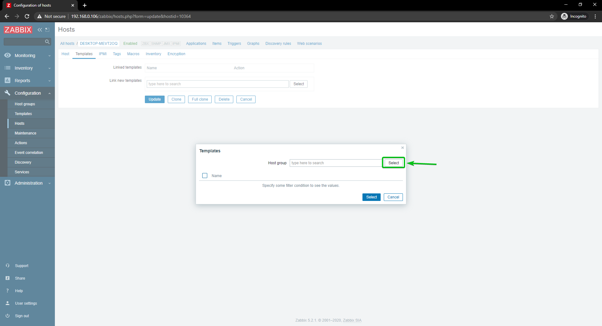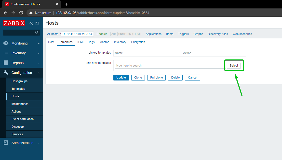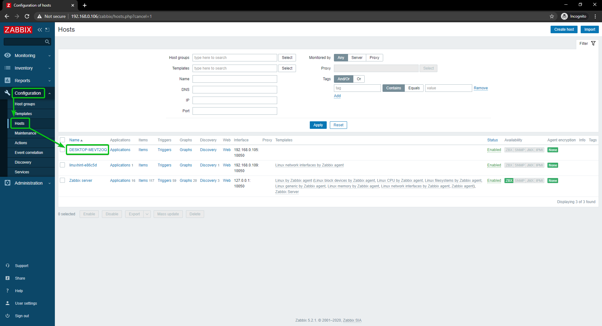 First, navigate to Configuration > Hosts and click on the Windows 10 Host that you want to monitor network usage.