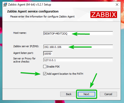 Make sure that the hostname is correct. Type in the Zabbix server IP address and check the Add agent location to the PATH checkbox.