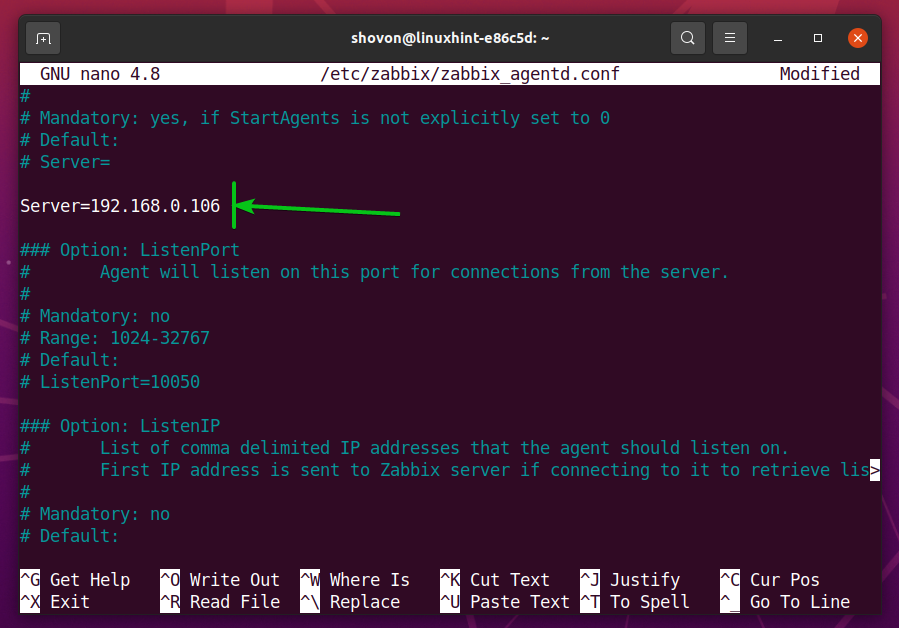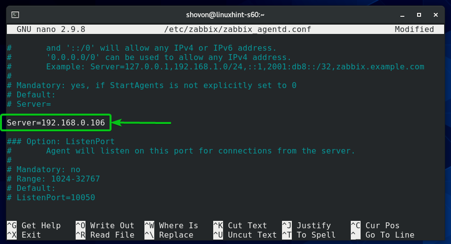 Once you’re done, press <Ctrl> + X followed by Y and <Enter> to save the /etc/zabbix/zabbix_agentd.conf file.