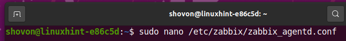 Open the Zabbix Agent configuration file /etc/zabbix/zabbix_agentd.conf with the following command: