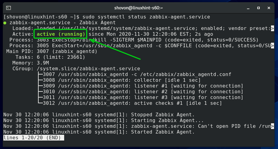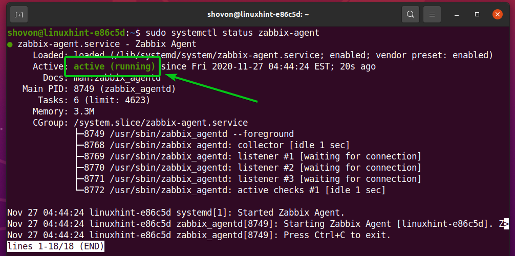 The zabbix-agent should be running, as you can see in the screenshot below.