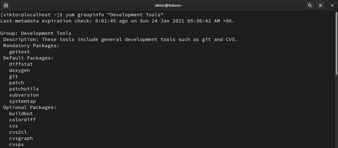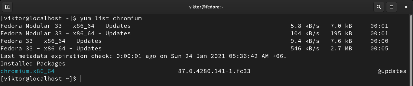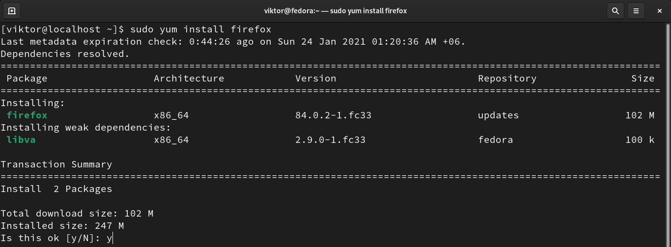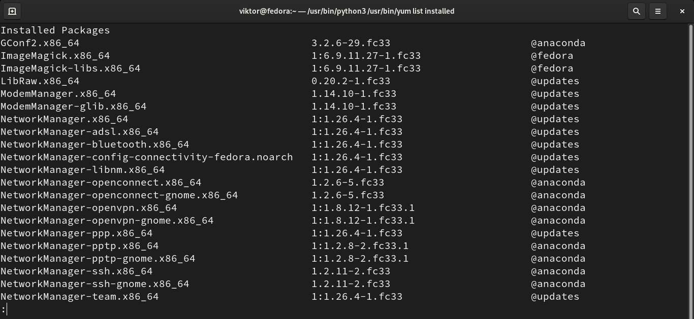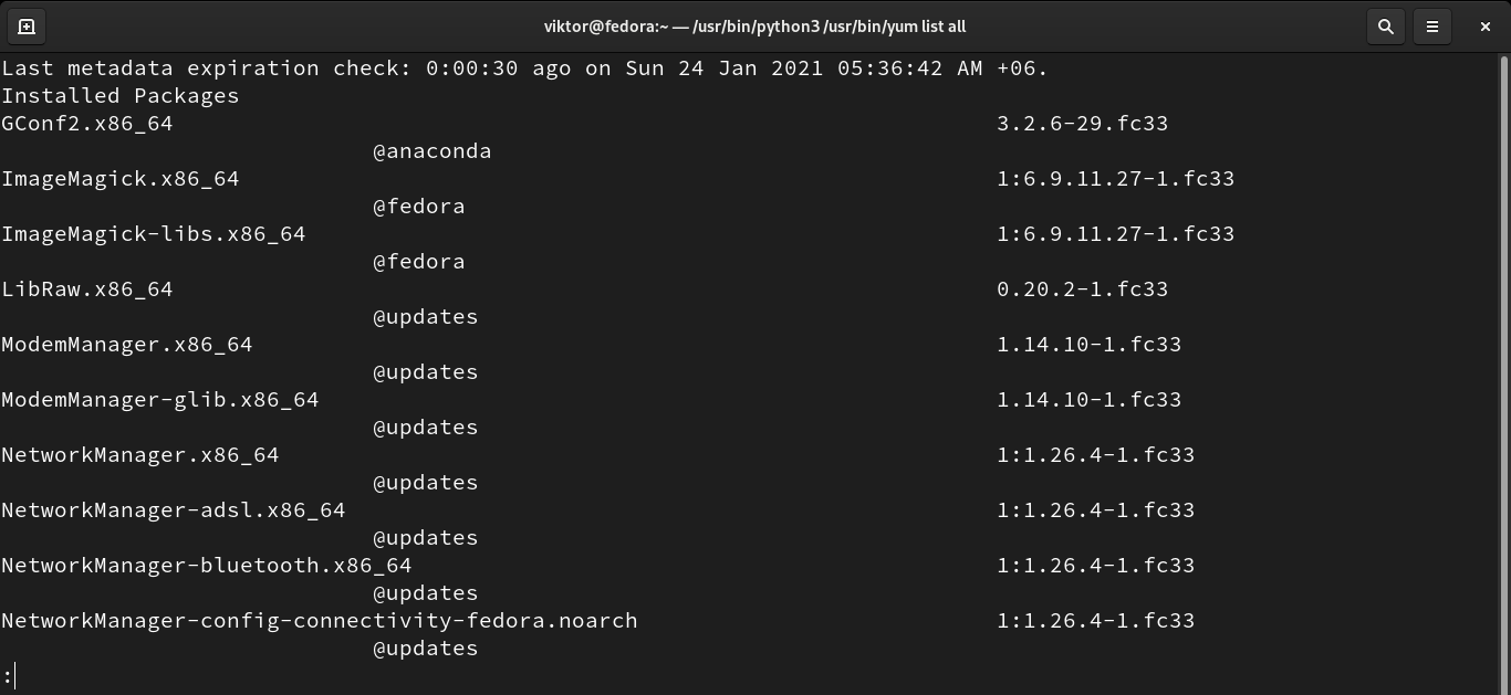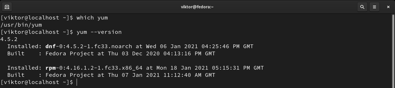As one of the default package managers, YUM should come pre-installed with Fedora. Run the following commands to verify if YUM is installed: