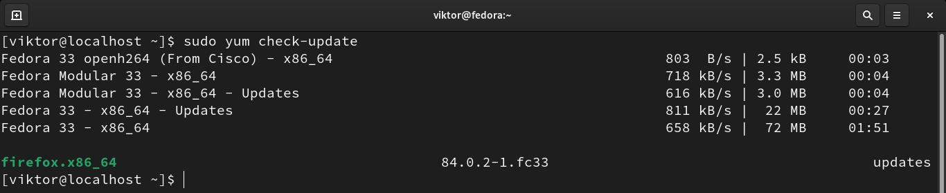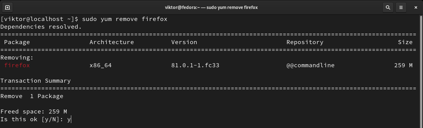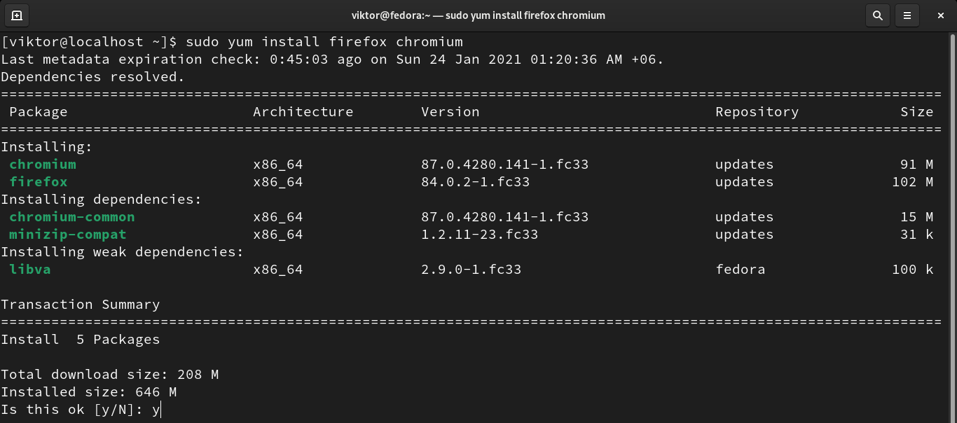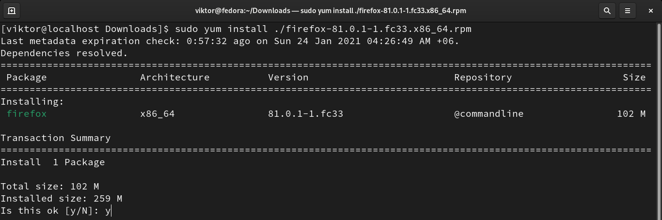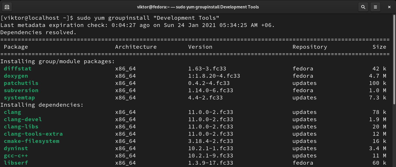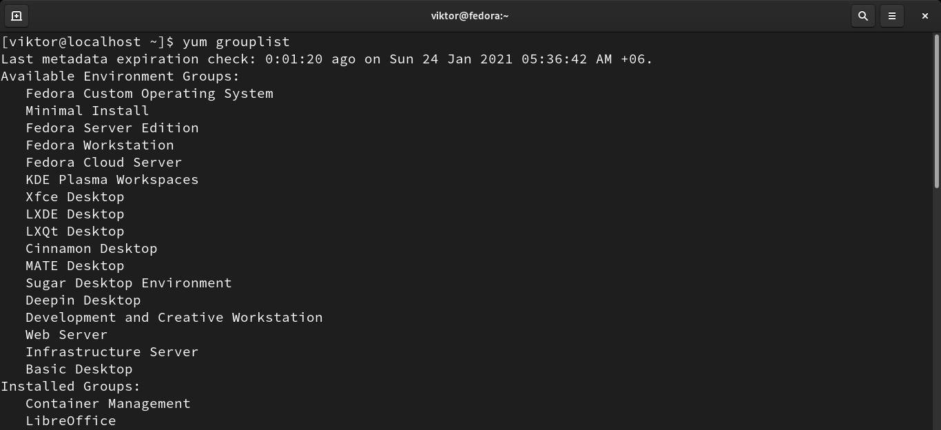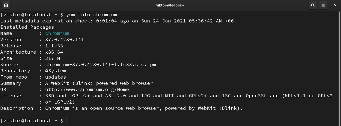 As one of the default package managers, YUM should come pre-installed with Fedora. Run the following commands to verify if YUM is installed: