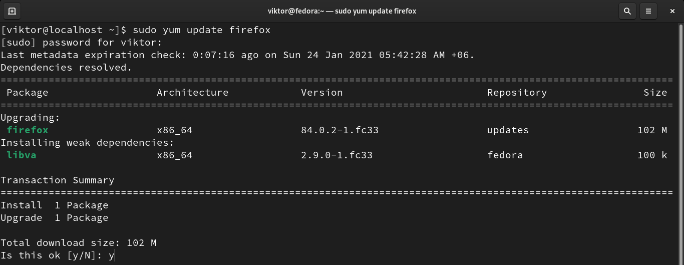 If there’s an update available for a certain package, it’s possible to individually update the package. By default, YUM will download and install the latest version of the package with dependencies.
