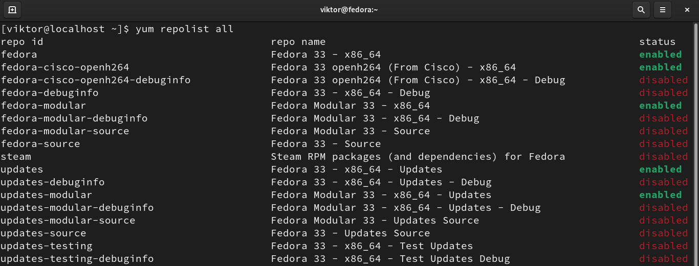 If there are some disabled repos, those won’t show on this list. To list all the repositories, run the following command: