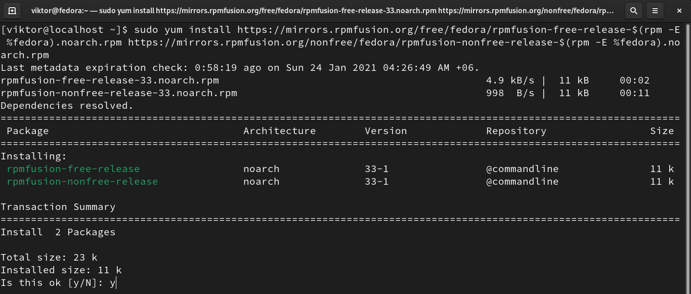 It’s also possible to install an RPM package that’s available through a direct link. In the following example, YUM will download and install the RPM Fusion repo.