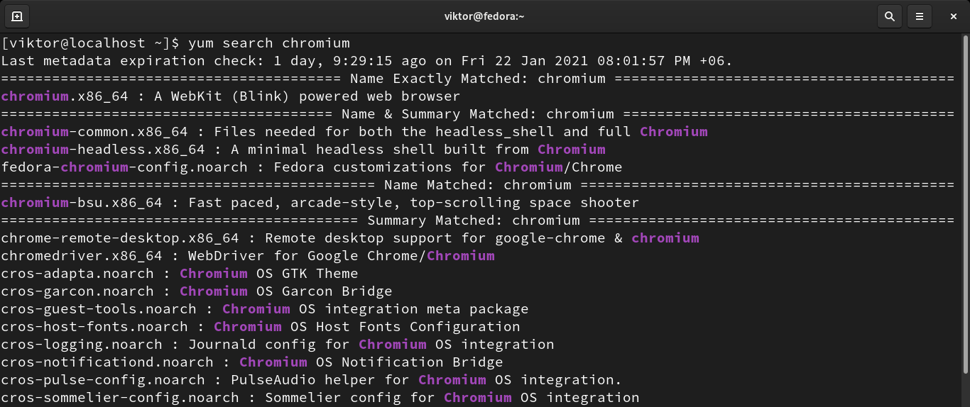 In many situations, the exact package name for a certain app is hard to keep track of. In such situations, the built-in searching feature of YUM comes really handy.