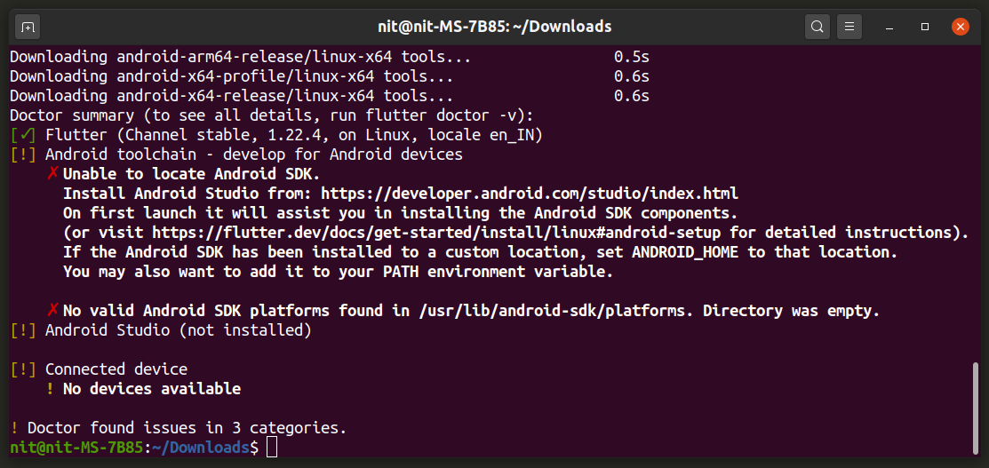 If you want to develop Android apps using Flutter, click on the links visible in the terminal output and follow relevant steps to install Android SDK.