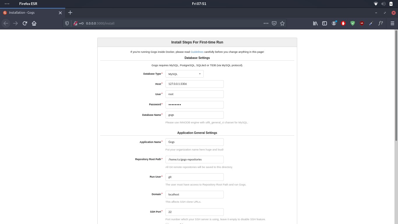 Once the webserver is running, launch the gogs web interface using the address http://localhost:3000