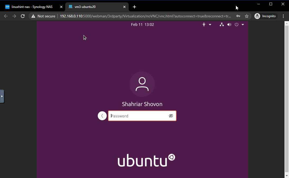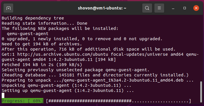 Once you connect to the virtual machine and log in to Ubuntu 20.04 LTS, you need to install QEMU Guest Agent. QEMU Guest Agent will report usage information (network, disk, memory, CPU, etc.) to the Virtual Machine Manager app of your Synology NAS.