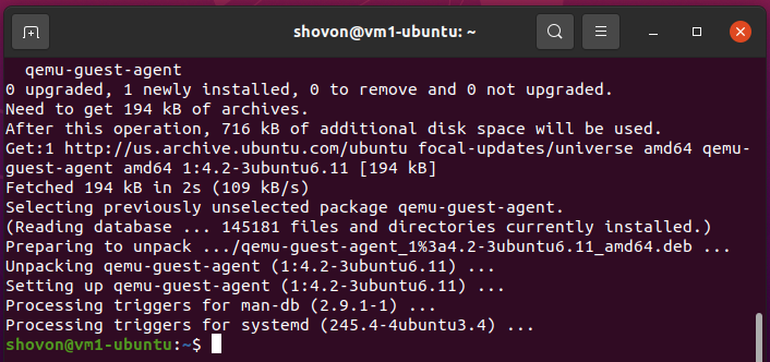 To install QEMU Guest Agent on your Ubuntu 20.04 LTS virtual machine, run the following command: