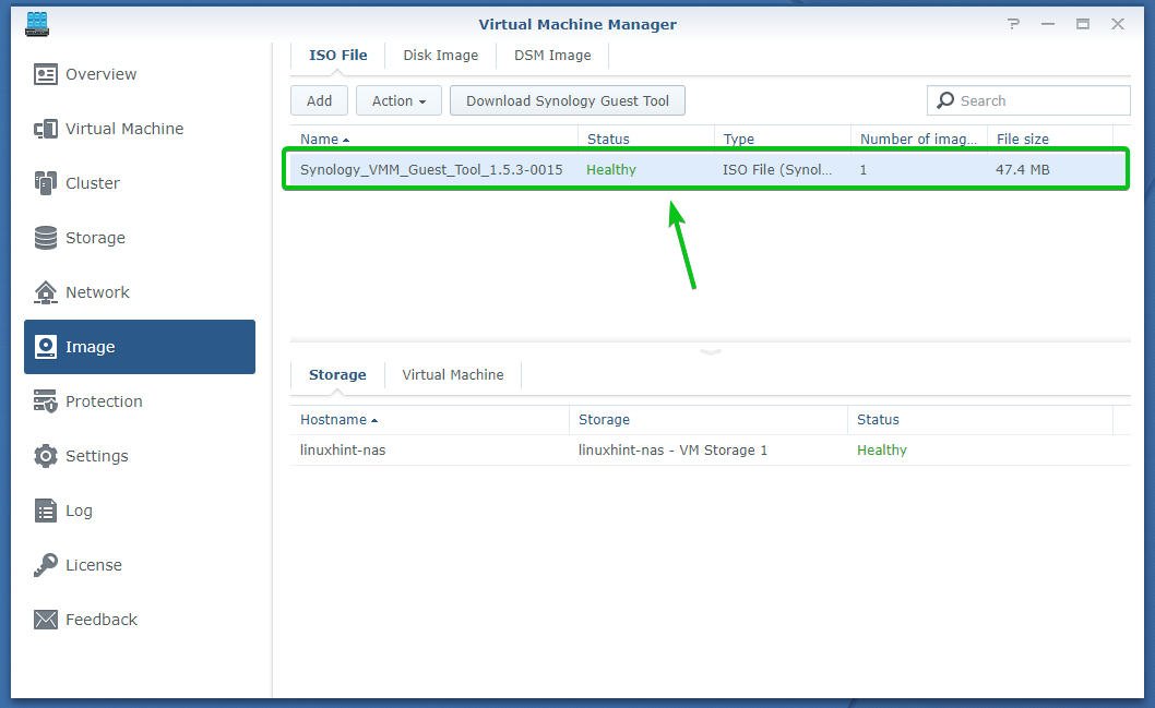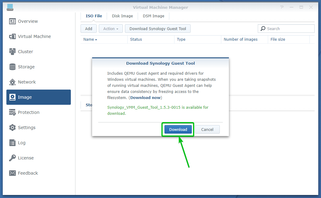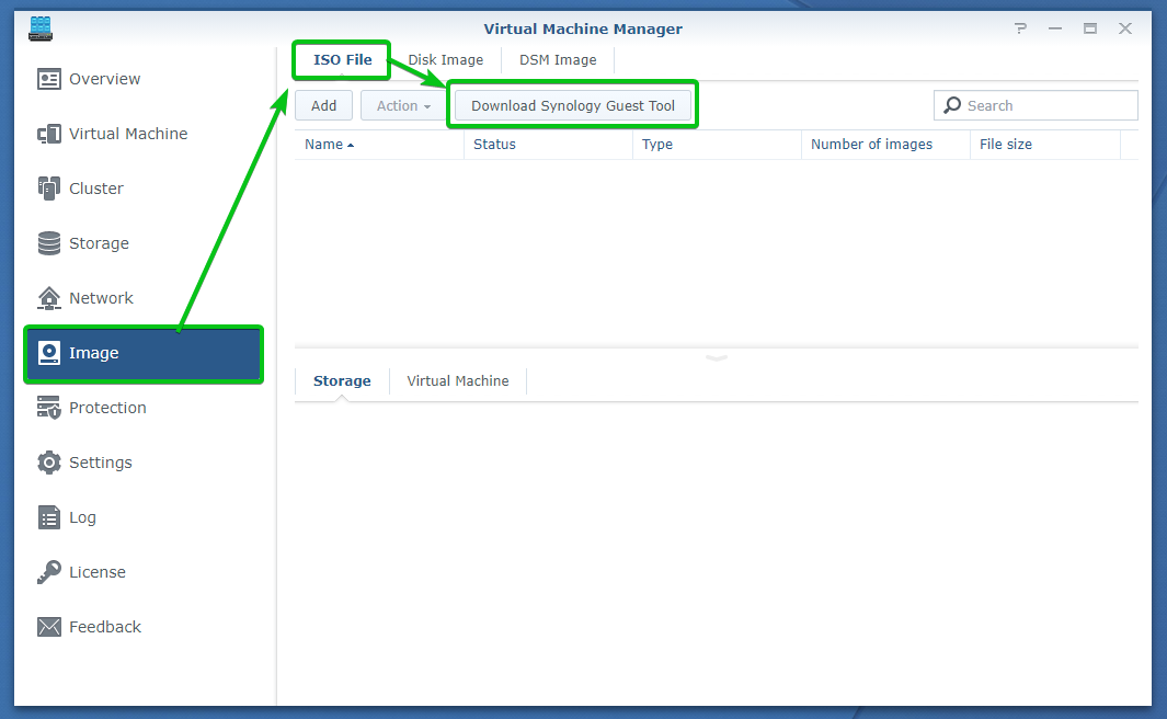 To download the Synology Guest Tool ISO image, open Virtual Machine Manager and navigate to the Image Section.