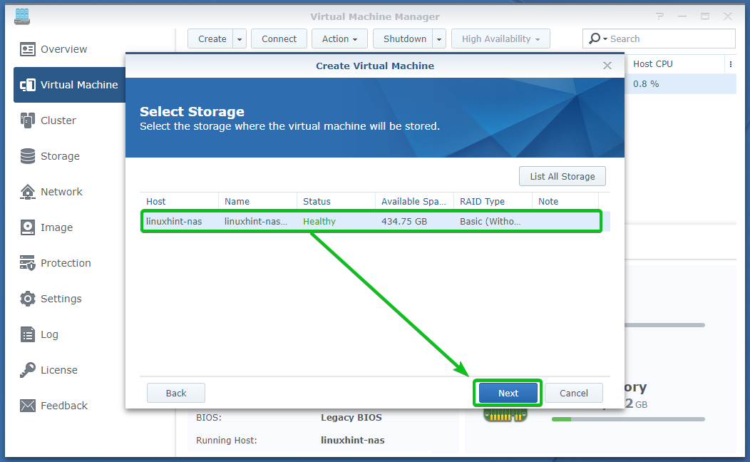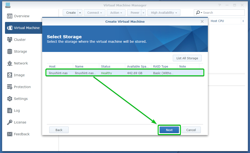 Now, you have to select a storage volume where you want to save the virtual machine data. Select a storage volume from the list and click on Next.