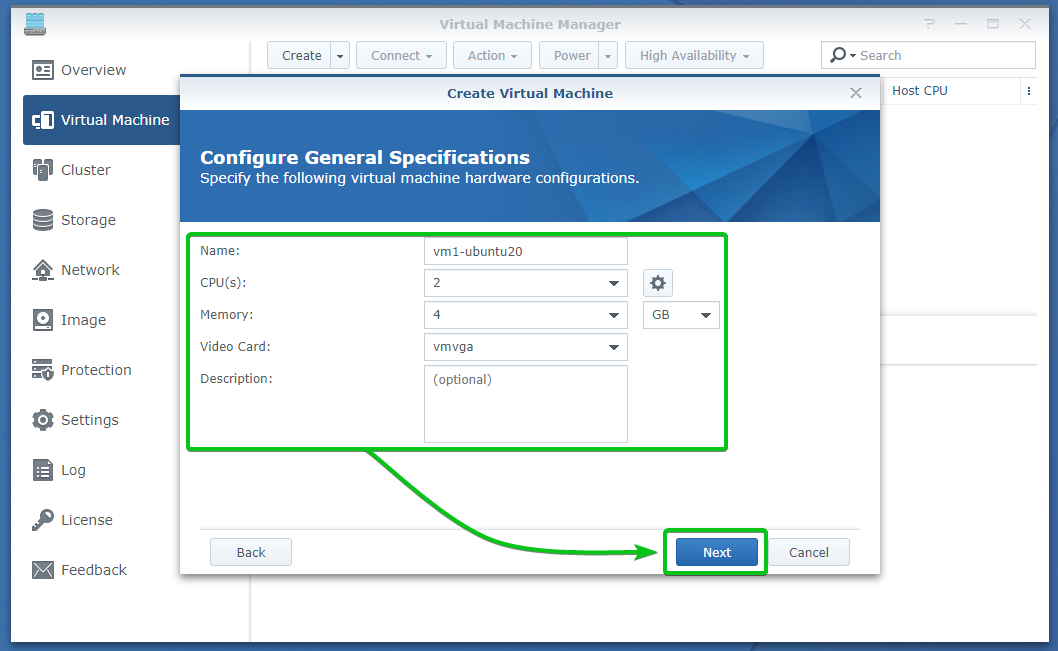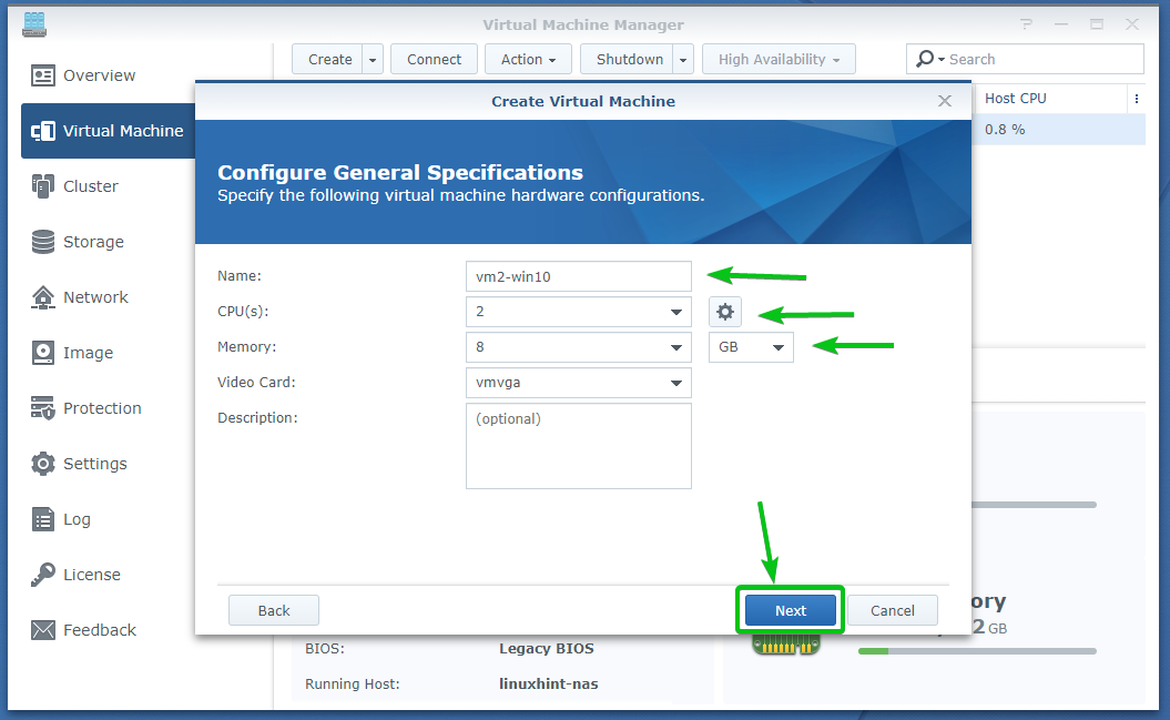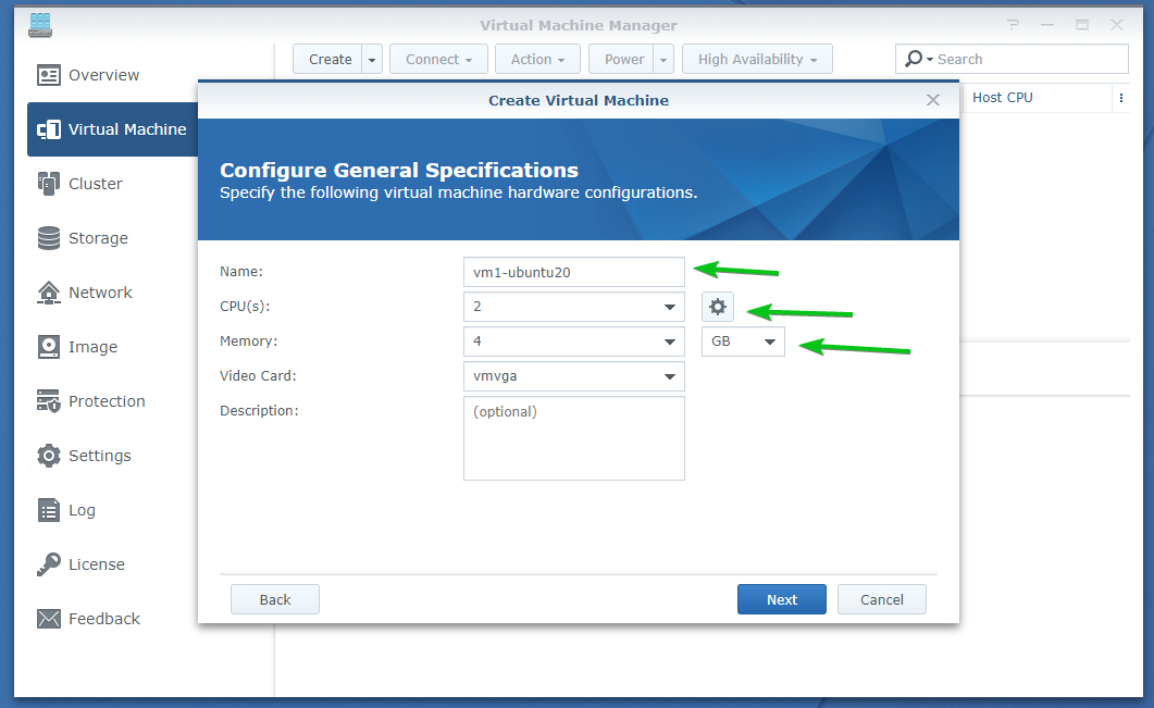 Type in a name for the virtual machine, the number of CPU cores you want it to have, and the amount of memory you want to allocate to it.