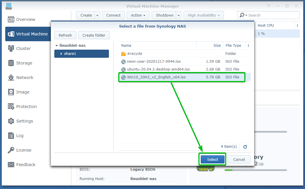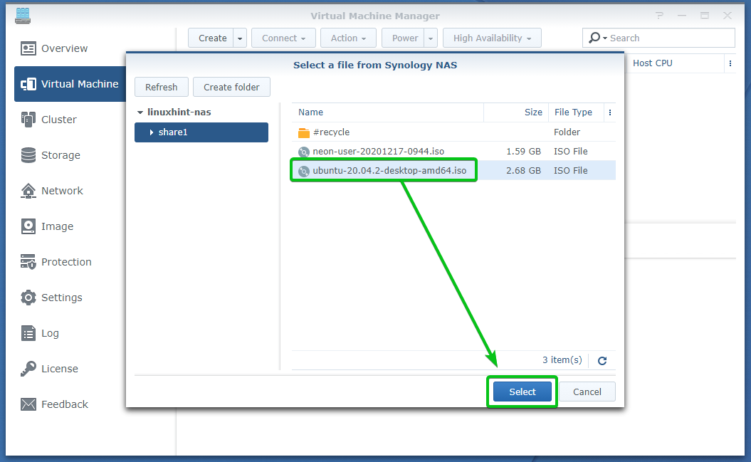 Select the Ubuntu 20.04 LTS ISO image from the Synology NAS, then share and click on Select, as marked in the screenshot below.