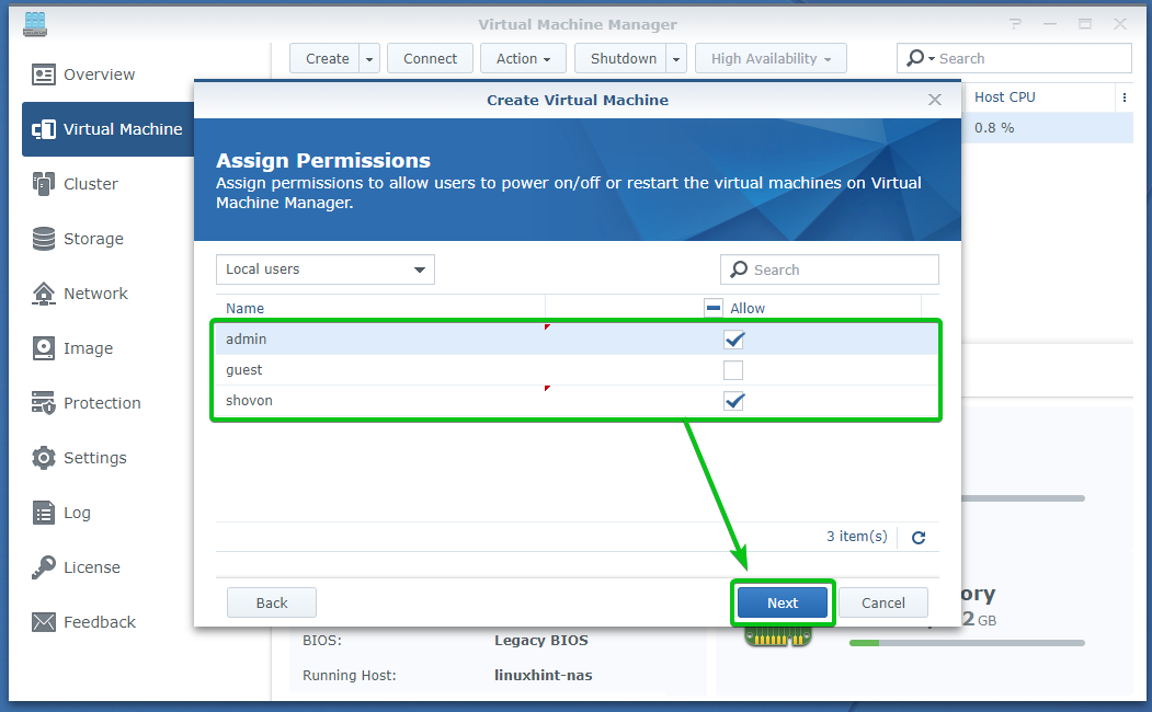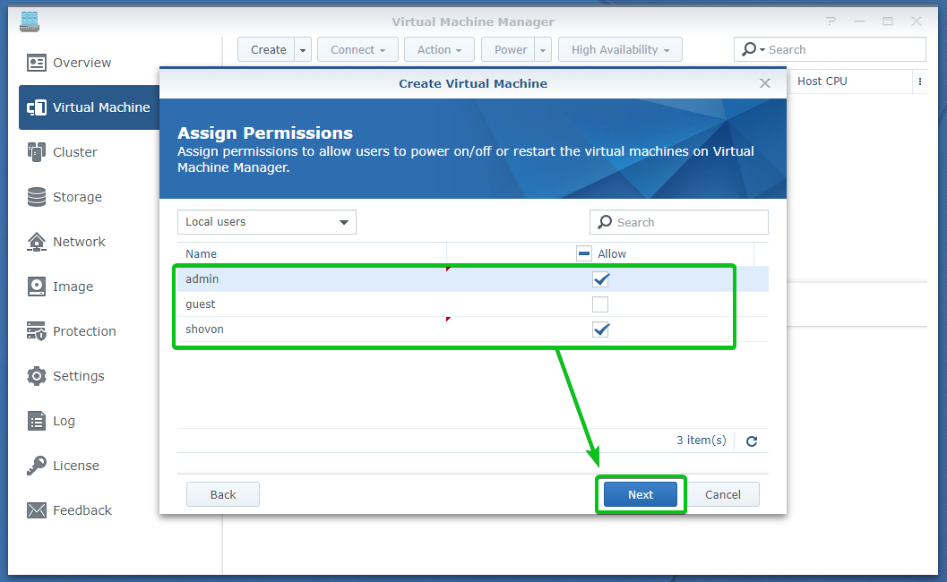 Select the users that you want to allow access to the virtual machine and click on Next.