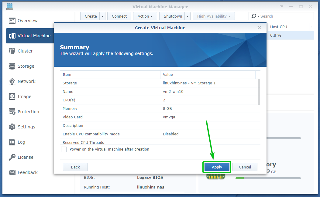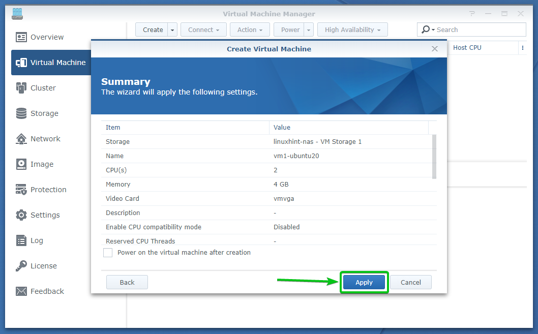The settings that will be used to create the virtual machine should be displayed. To create a virtual machine with those settings, click on Apply.