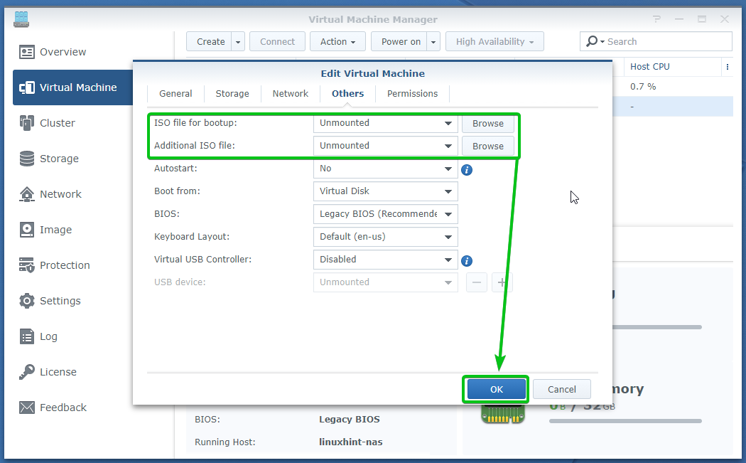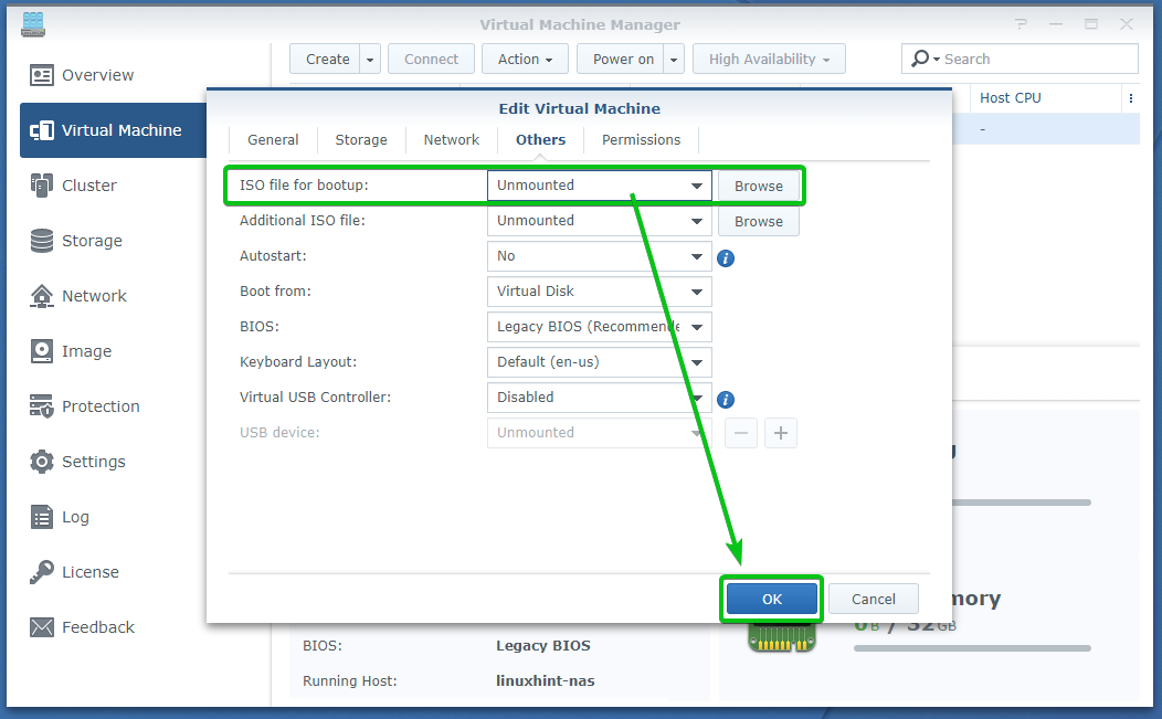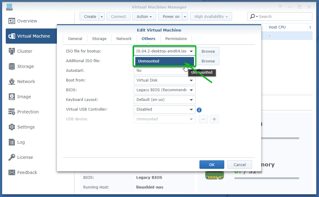 Once you’ve selected Unmounted from the ISO file for bootup dropdown menu, click on OK.