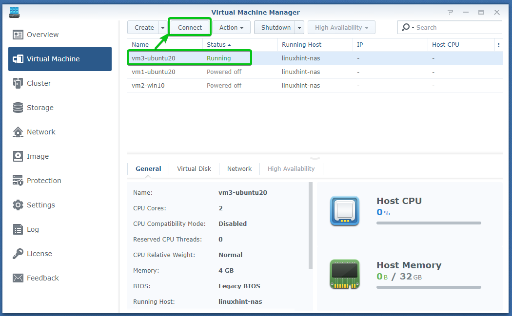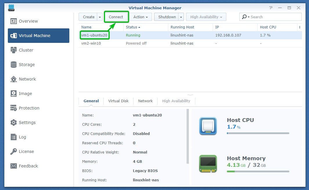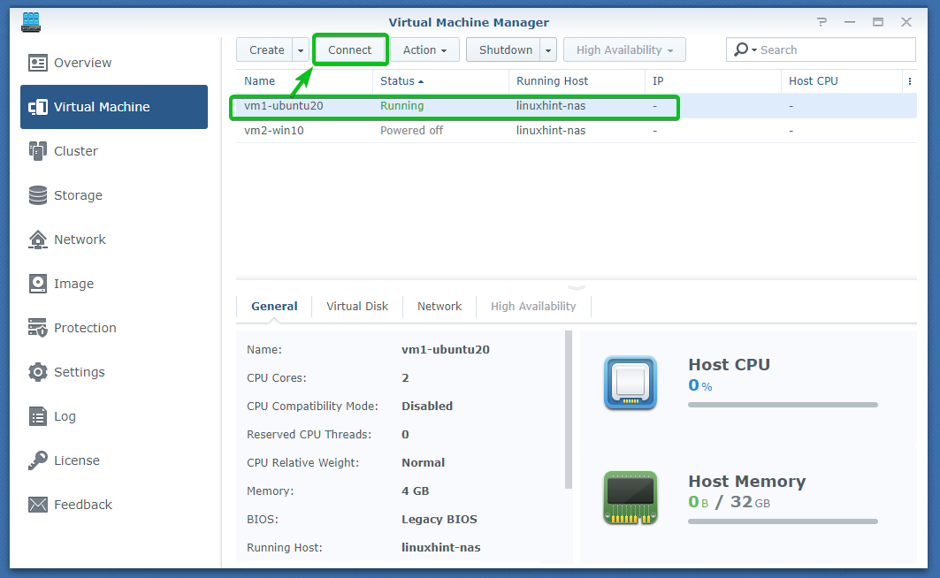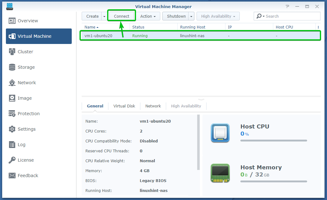 The vm1-ubuntu20 virtual machine should be Running. To connect to the display of the vm1-ubuntu20, select the virtual machine and click on Connect, as shown in the screenshot below.