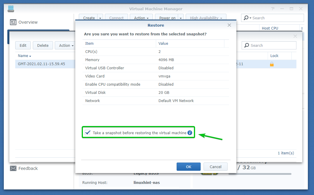 If you want to take a snapshot of the current state of the virtual machine before restoring from your selected snapshot, then check Take a snapshot before restoring the virtual machine checkbox, as marked in the screenshot below.