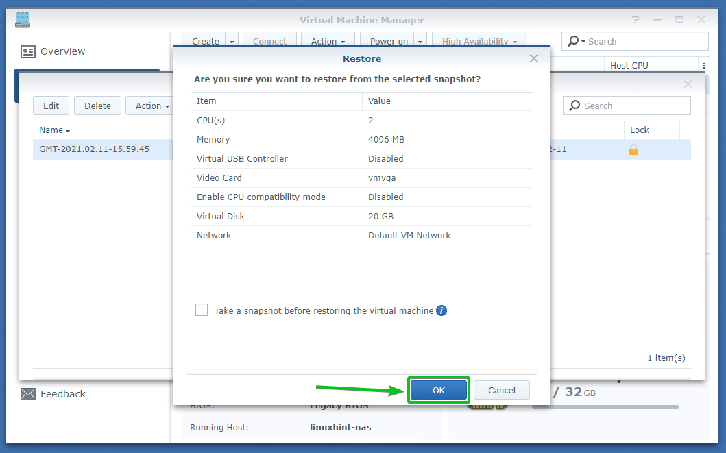 I am not going to take a snapshot of the current state of the virtual machine before restoring the virtual machine from a snapshot. So, I will leave the Take a snapshot before restoring the virtual machine checkbox unchecked.