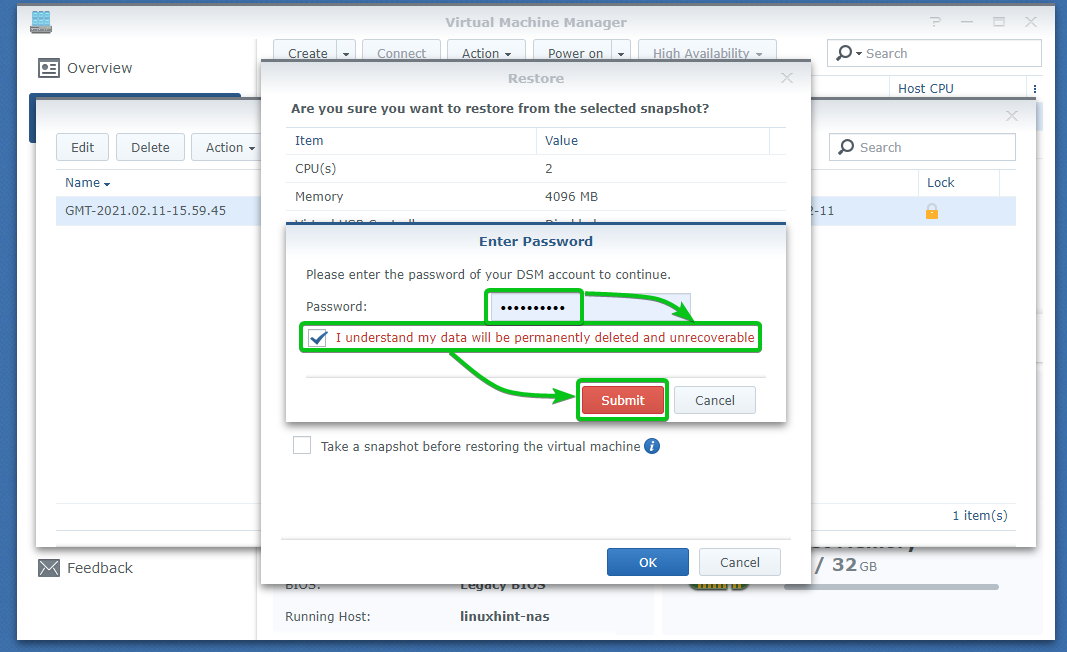Now, type in the login password of your Synology Web GUI and check I understand my data will be permanently deleted and unrecoverable checkbox.