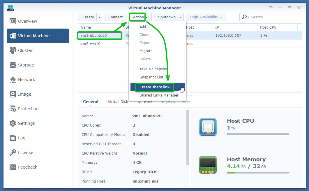 To share a virtual machine (let’s say, vm1-ubuntu20), select the virtual machine and click on Action > Create share link, as marked in the screenshot below.