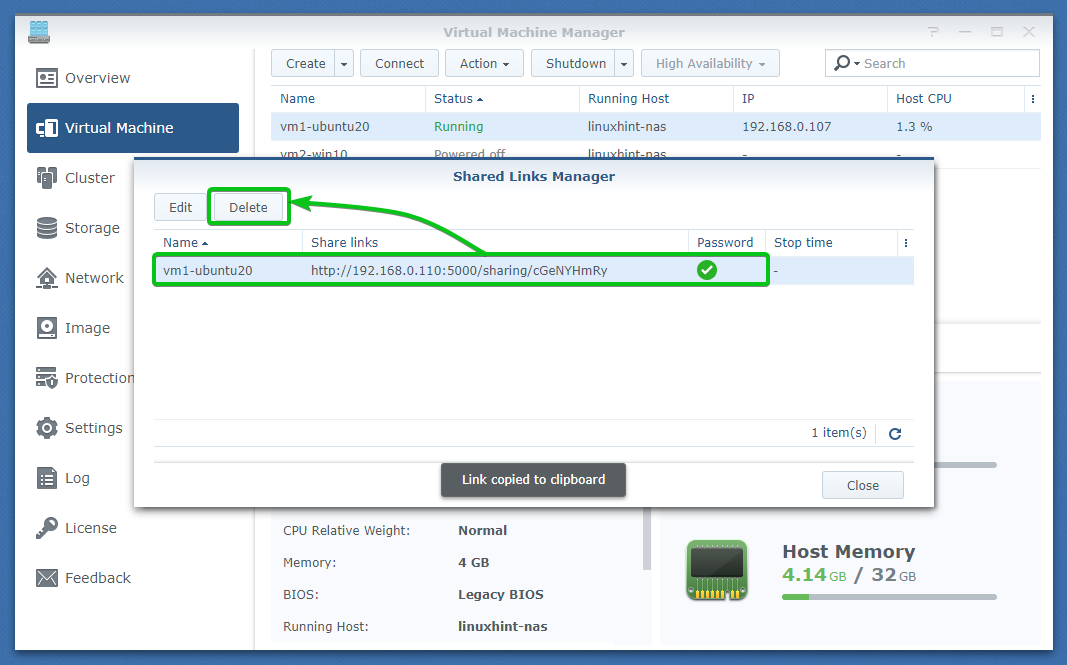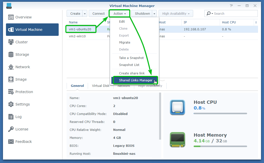 To see all the shared links for a virtual machine, select the virtual machine and click on Action > Shared Links Manager, as shown in the screenshot below.