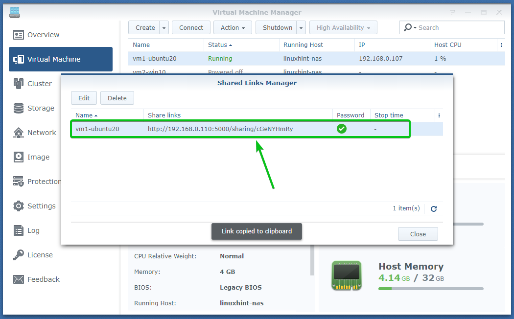 A shared link for accessing the virtual machine should be created and copied to the clipboard.