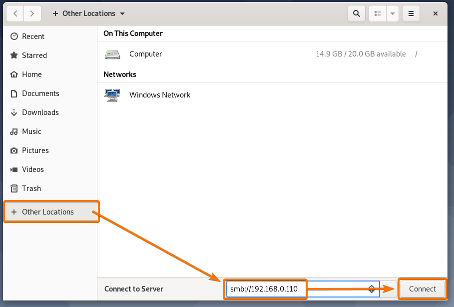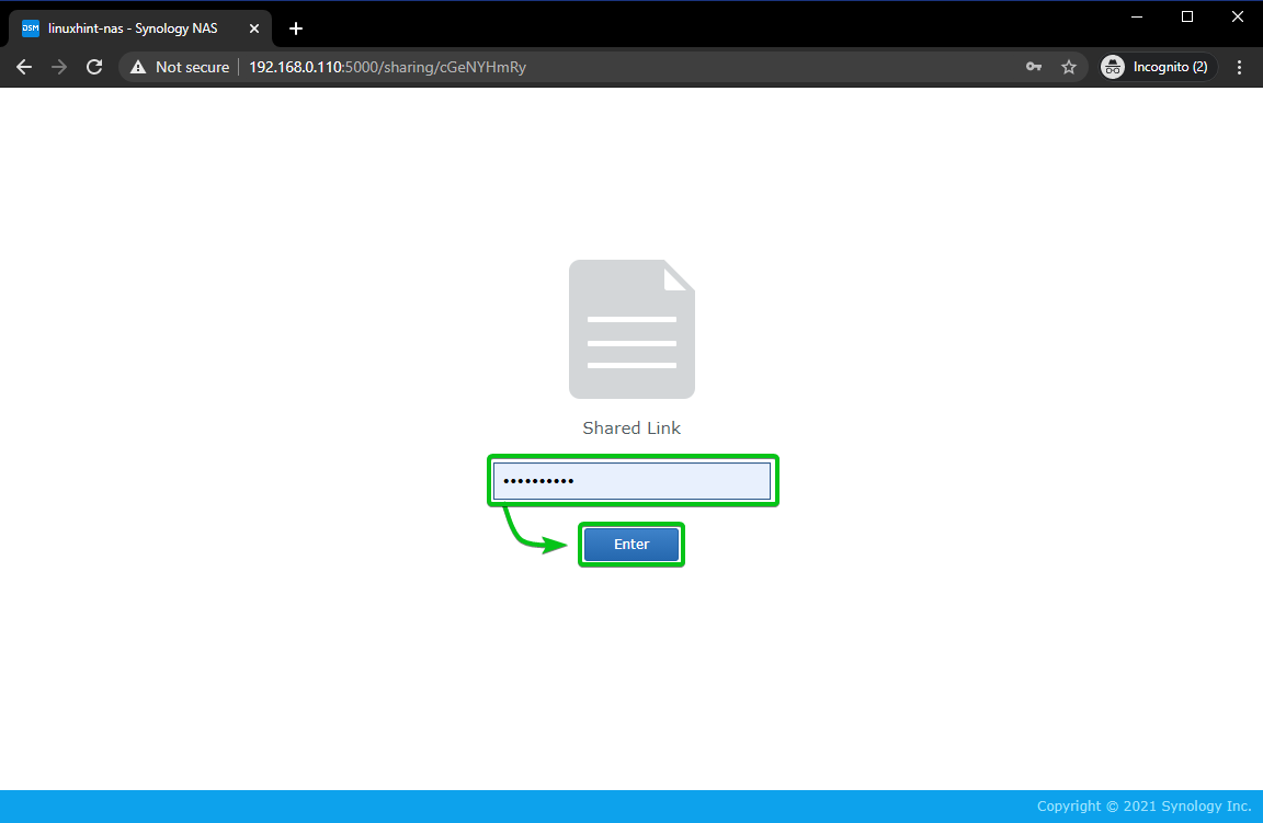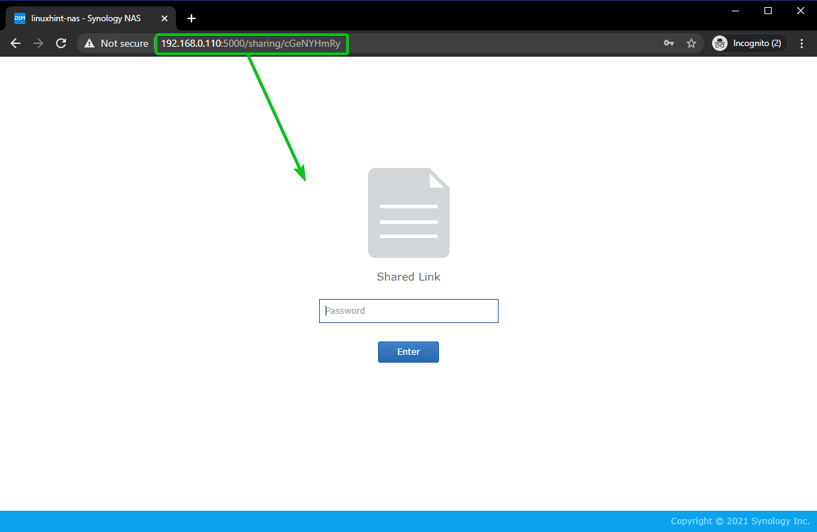 From Linux operating system, navigate to smb://192.168.0.110 from any file manager app to access the shares on your Synology NAS.