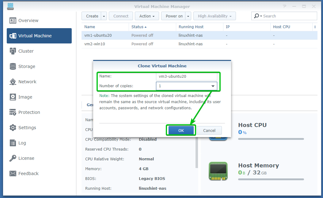 You can create multiple cloned virtual machines as well. To do so, select the number of clones you want from the Number of copies dropdown menu.