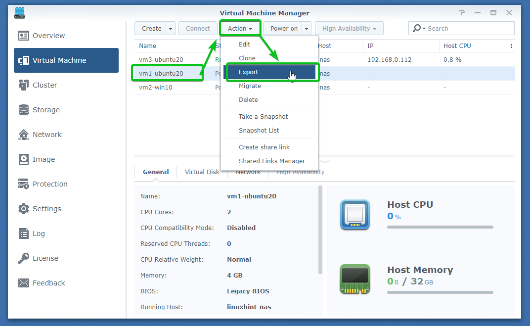 You can export Synology NAS virtual machines using the Virtual Machine Manager app.