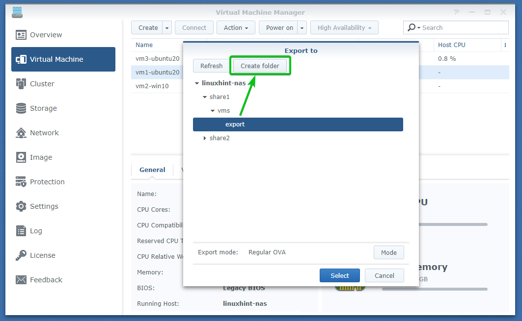 So, select a directory where you want to keep all your exported virtual machine data and click on Create folder to create a new folder for the exported virtual machine.