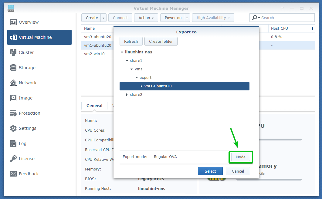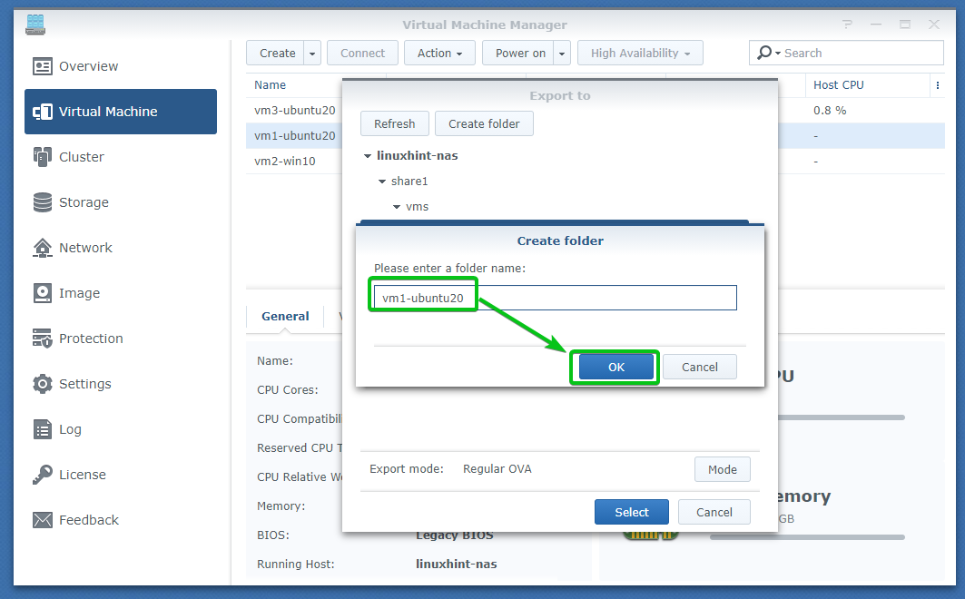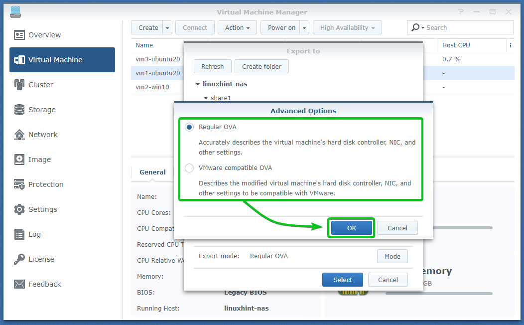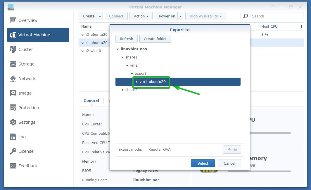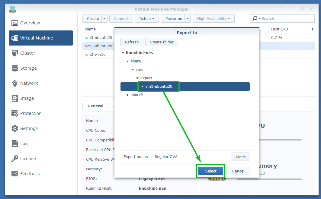 Now, you have to select a directory on your Synology NAS share where you want to export the virtual machine.